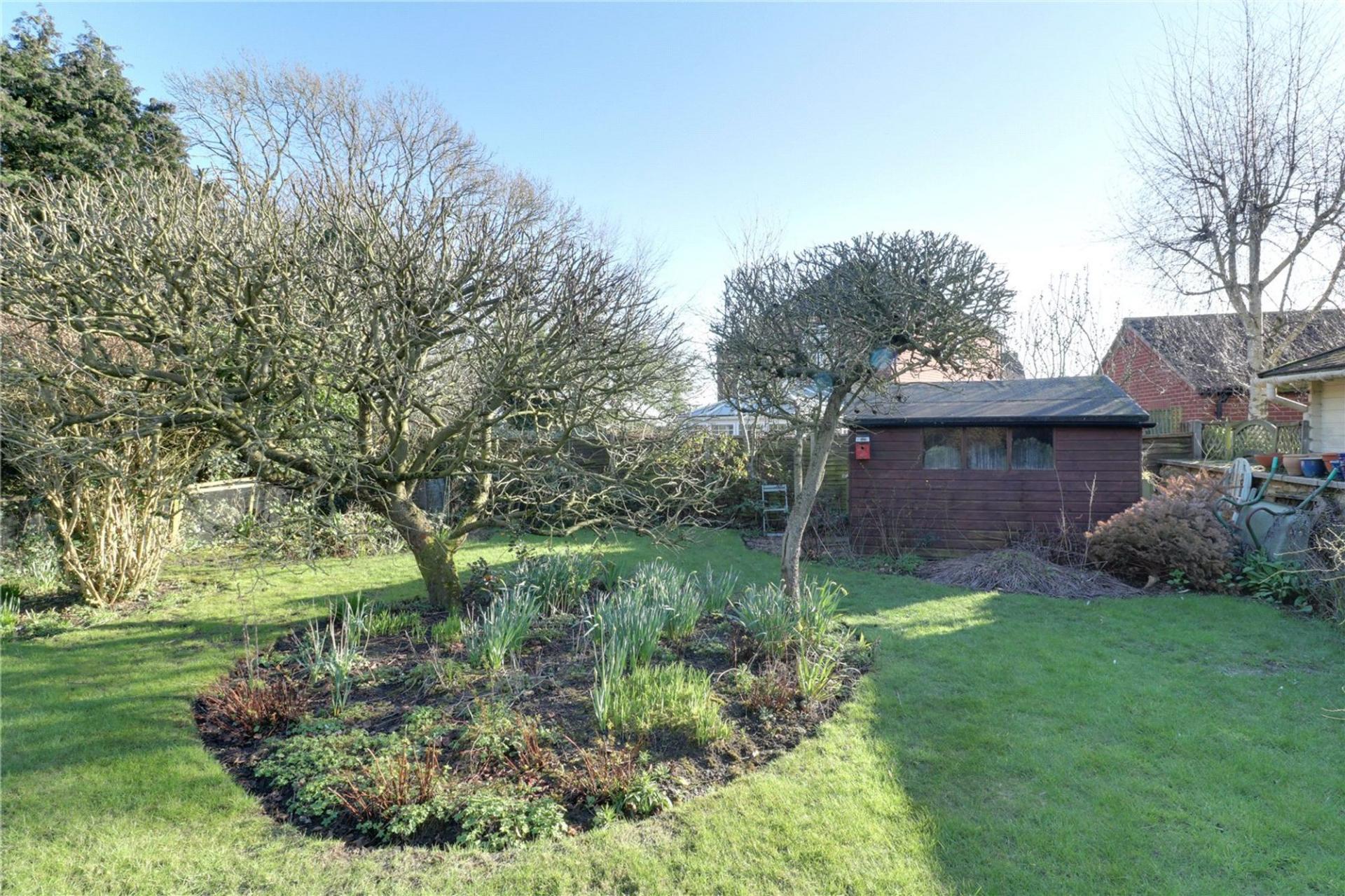 Externally, the property truly excels with its beautiful south-facing mature garden, offering well-maintained lawns, fully stocked borders and a variety of seating areas, perfect for relaxing or entertaining during the warmer months. A secure side gate leads to a gravelled driveway providing off-street parking for several vehicles.