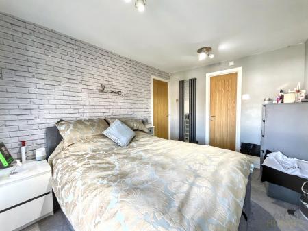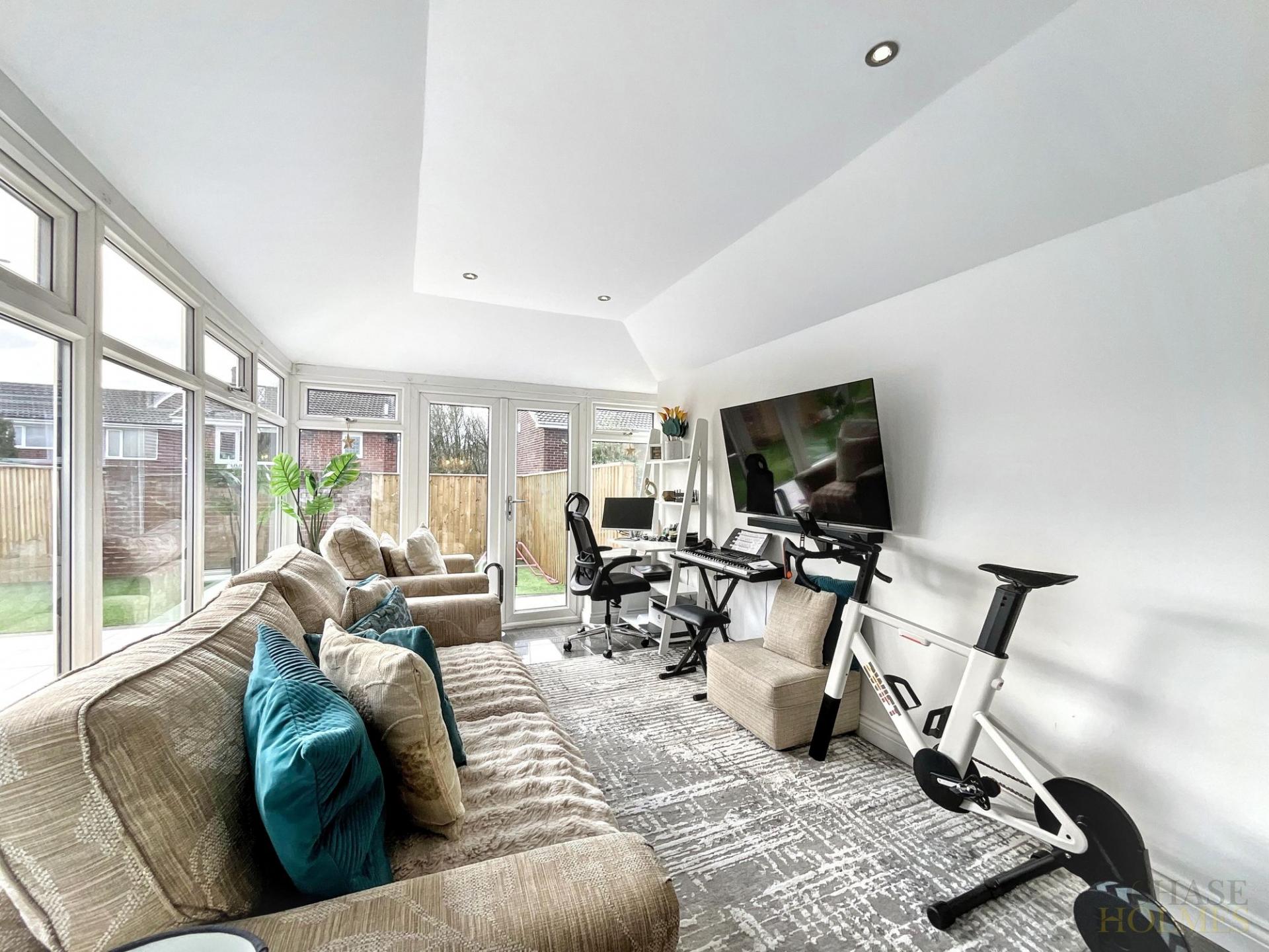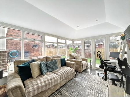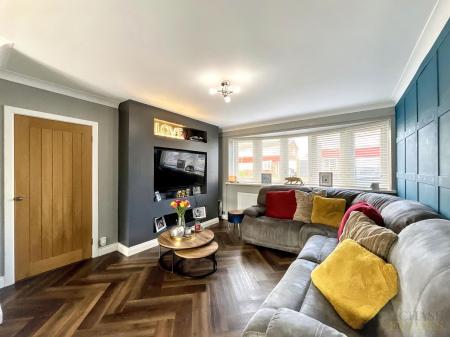 Upon entering, you are welcomed into a thoughtfully designed interior. The contemporary kitchen is fitted with integrated appliances, sleek cabinetry, and generous worktop space, making it ideal for both everyday living and entertaining. The open-plan living area is a standout feature, complete with a stylish media wall and elegant herringbone wood flooring that flows seamlessly throughout, creating a warm and inviting atmosphere. French doors open onto the garden, allowing natural light to flood the space while providing a pleasant outdoor outlook. A bright conservatory further enhances the ground floor, offering a versatile area perfect for dining, relaxing, or working from home.