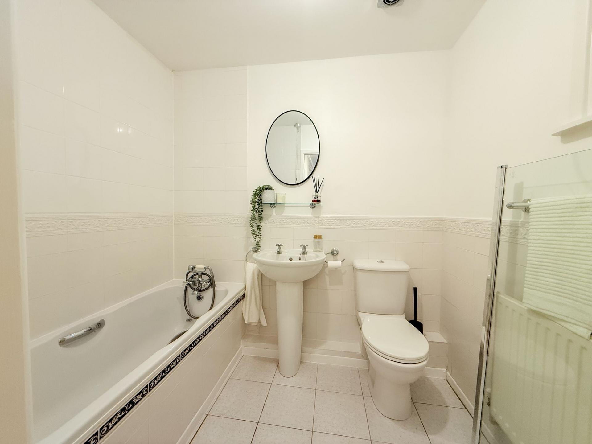 The  main bedroom benefits from an en-suite shower room, adding a touch of luxury and convenience. A well-proportioned second bedroom offers flexibility—perfect as a guest room, home office, or nursery. Completing the accommodation is a main bathroom, featuring a modern suite.