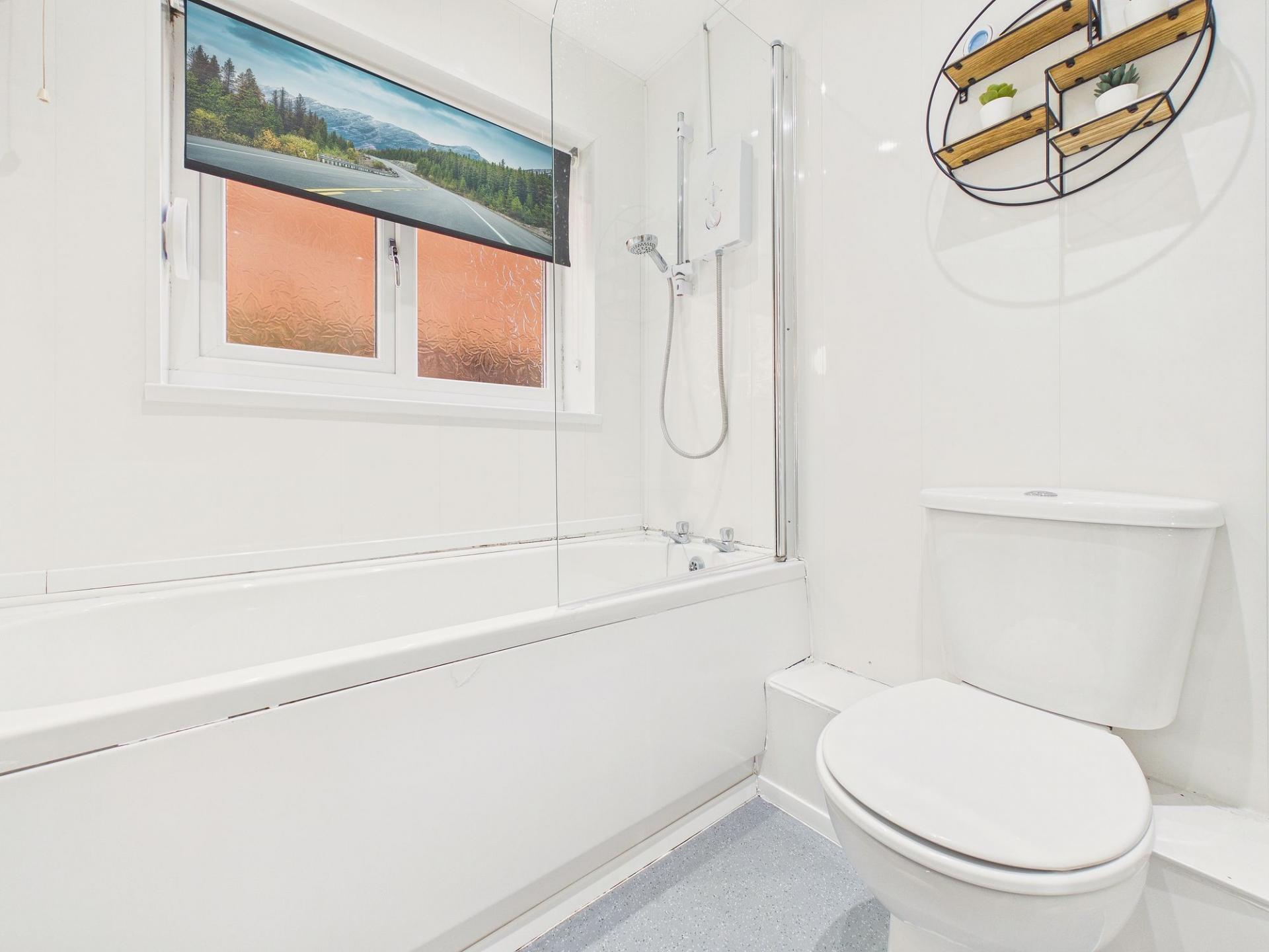 The accommodation further comprises two well-proportioned bedrooms, both offering comfortable sleeping space and versatility for use as a guest room, home office or dressing room if desired. Completing the internal layout is the bathroom, which is fitted with a modern white suite and benefits from an electric shower positioned over the bath.