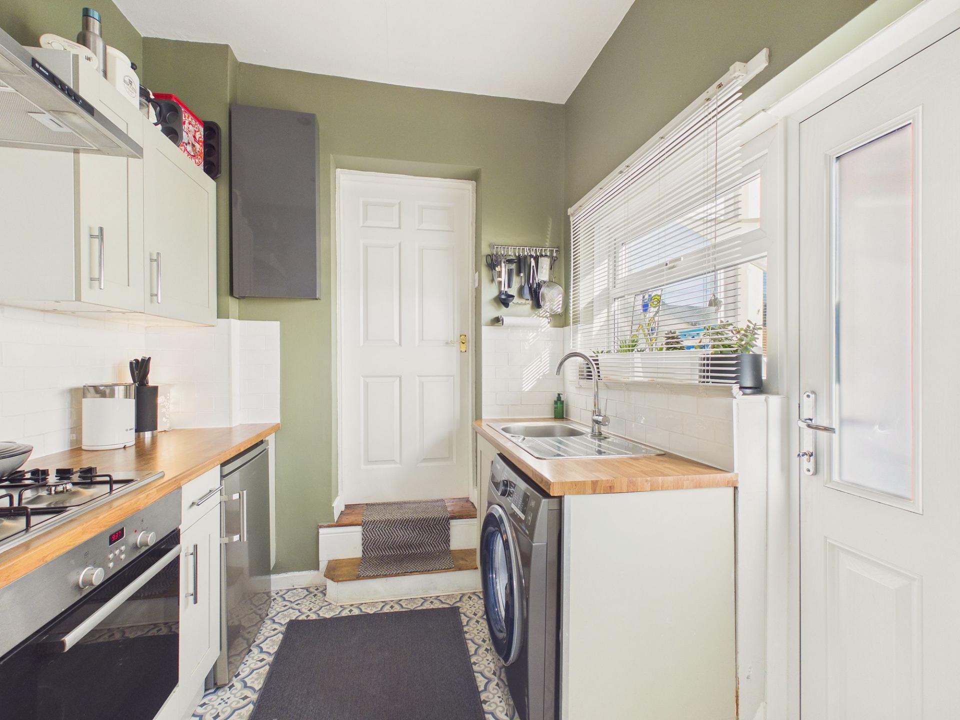Leading directly from the lounge is a modern fitted kitchen, thoughtfully designed with a range of wall and base units and incorporating built-in cooking appliances. Under bench space is available for the inclusion of a washing machine along with additional kitchen appliances, making it both practical and functional for everyday living.