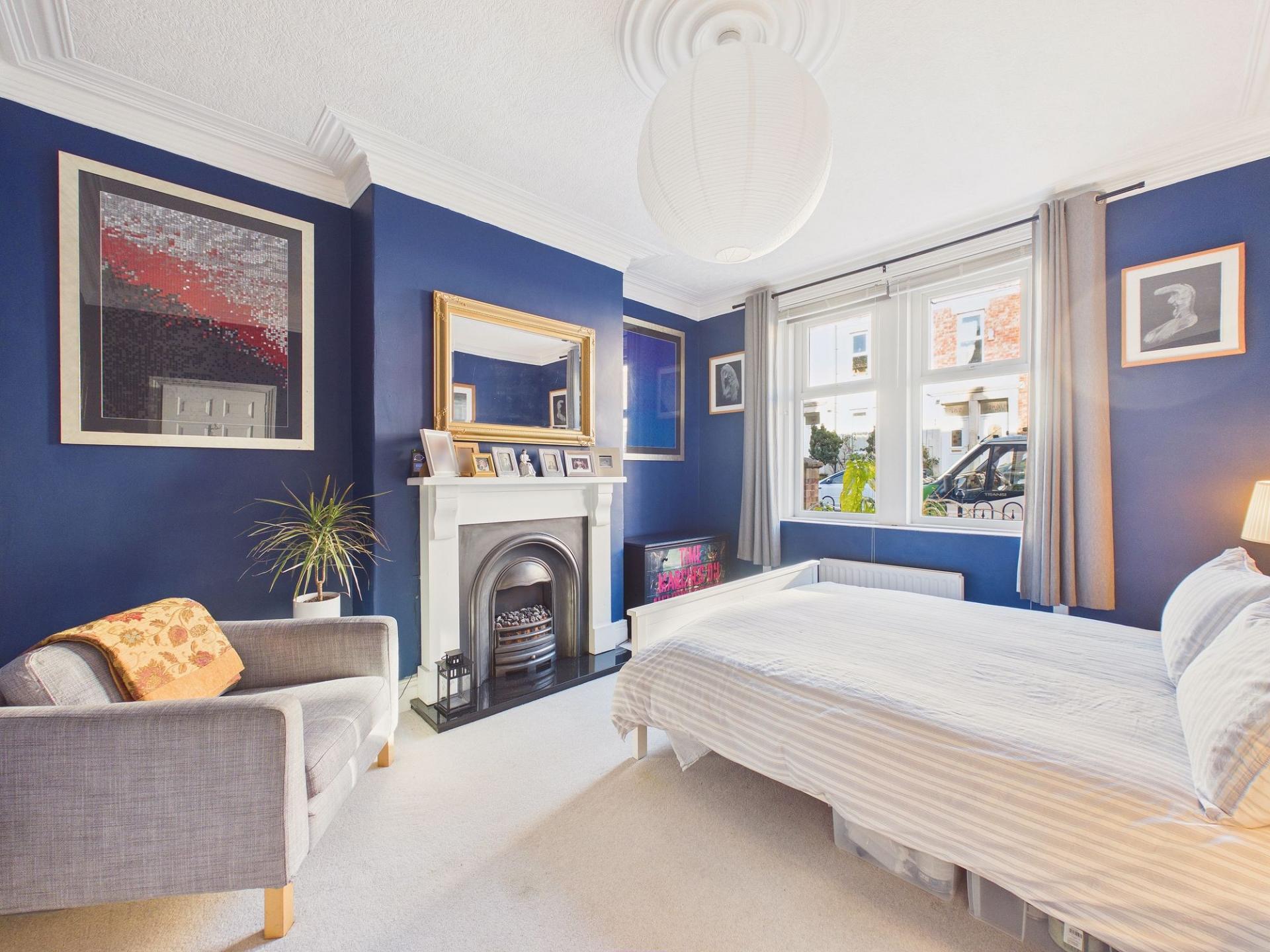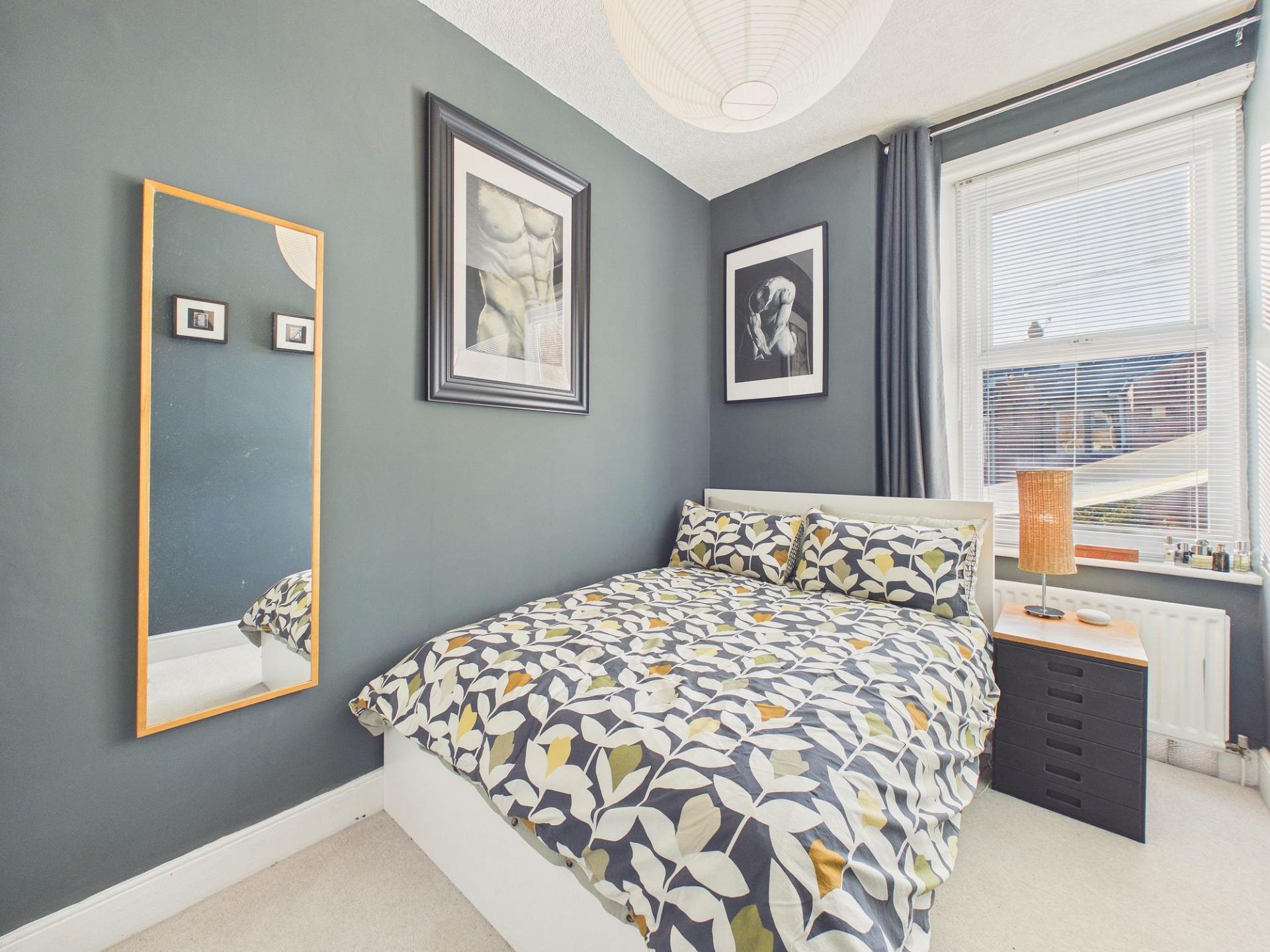 The main bedroom is located to the front aspect of the property and enjoys charming period-style features including traditional coving to the ceiling, a central ceiling rose and an attractive decorative fireplace set within the chimney breast, adding character and elegance to the room. The second bedroom is also a well-proportioned double room, currently shown accommodating a double bed, making it ideal as a guest room, home office or additional bedroom space.