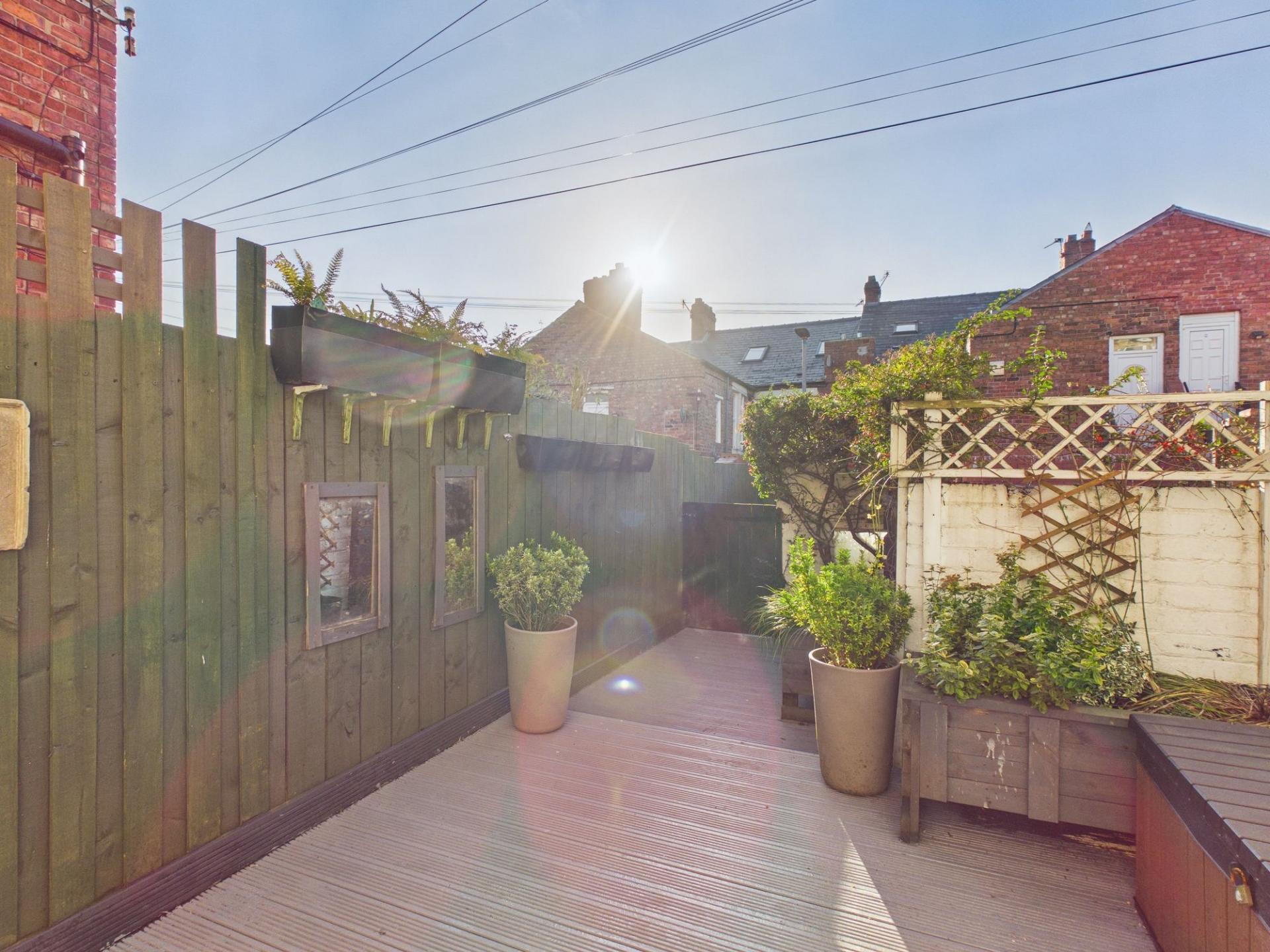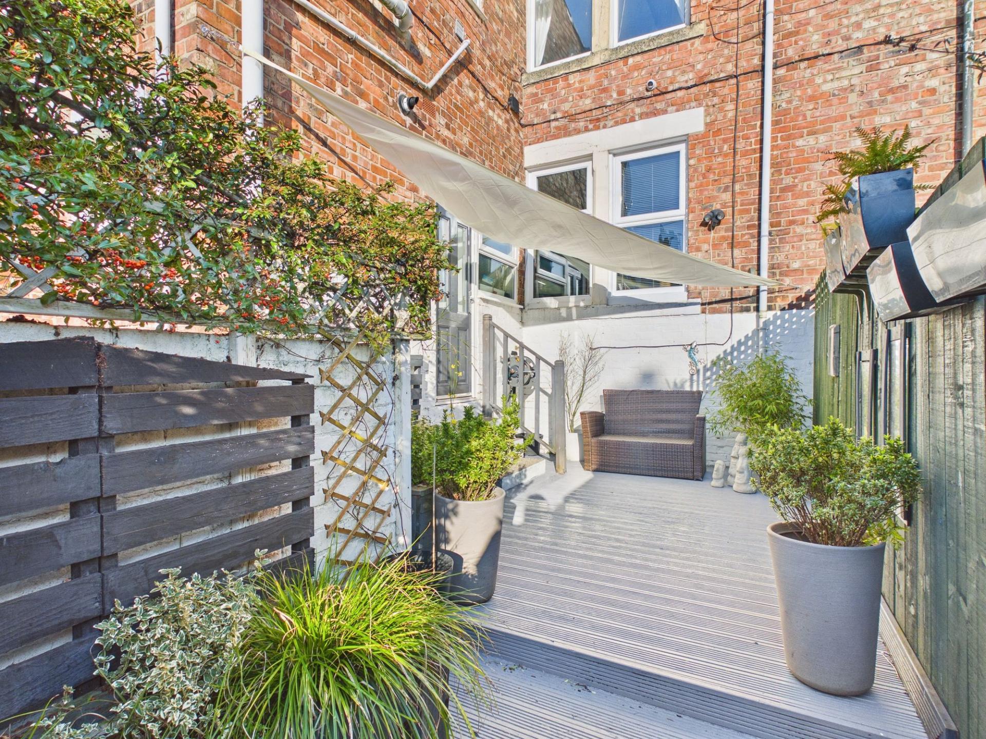 Externally, the property benefits from an enclosed courtyard to the rear. Predominantly decked, this appealing outdoor area provides space for several seating arrangements and is perfectly suited for outdoor dining, relaxing, or entertaining guests during warmer months.