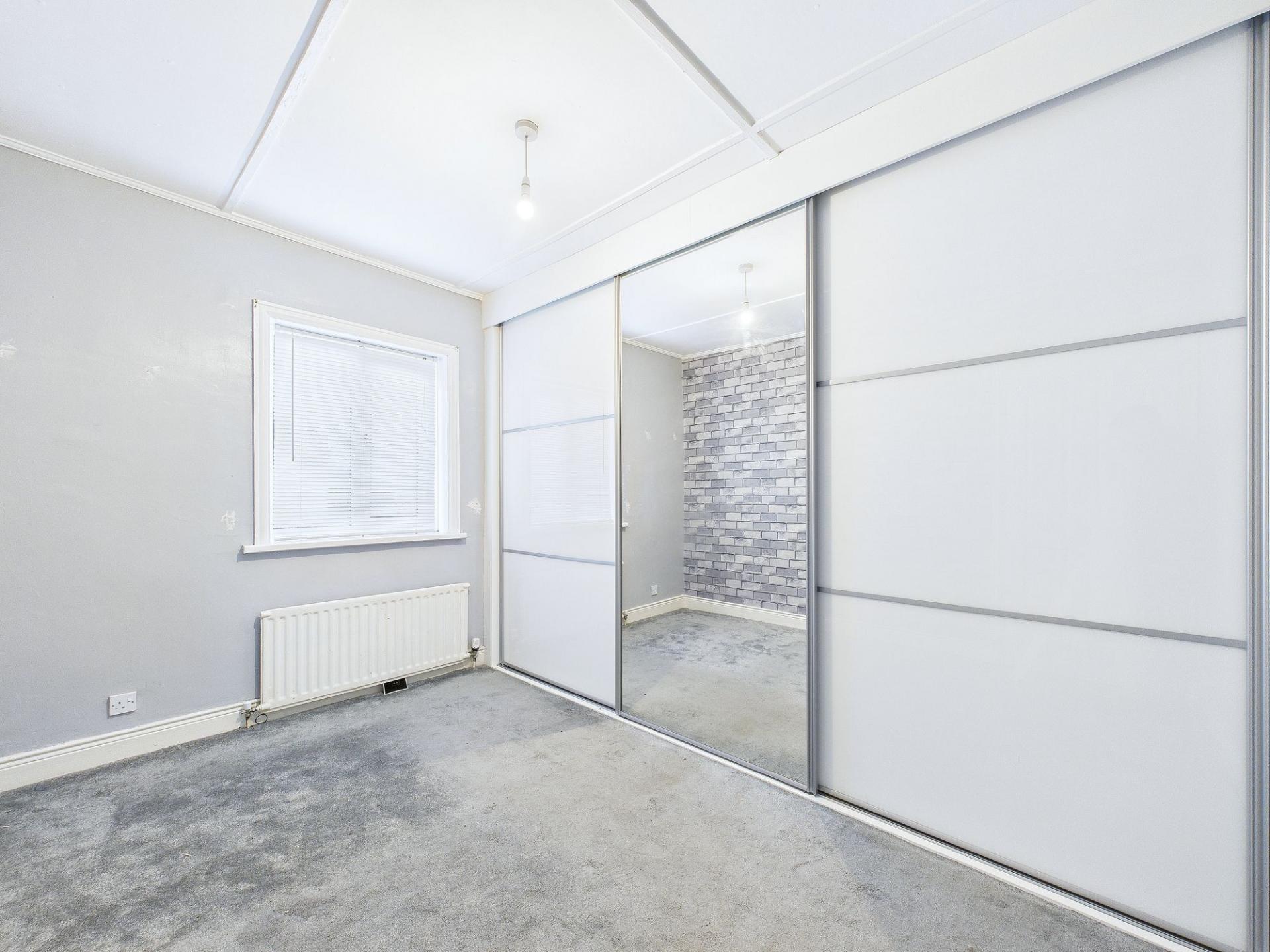 To the first floor, the property offers two generous double bedrooms, one of which benefits from built-in sliding door wardrobes, providing excellent storage while maintaining a sleek and uncluttered appearance. The modern bathroom is fitted with a white three-piece suite, including a panelled bath with an electric shower over, wash basin, and WC.