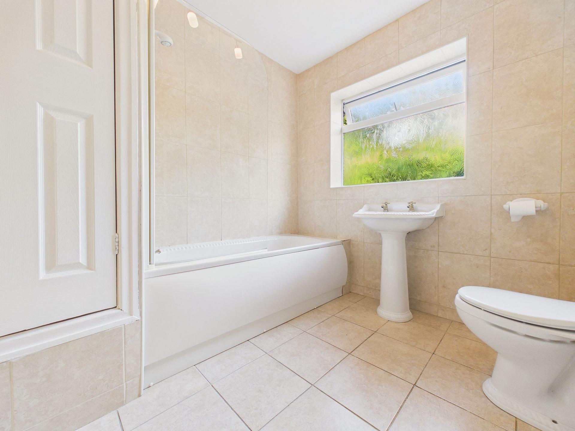 The bathroom is equipped with a modern white suite and includes a shower facility over the bath.