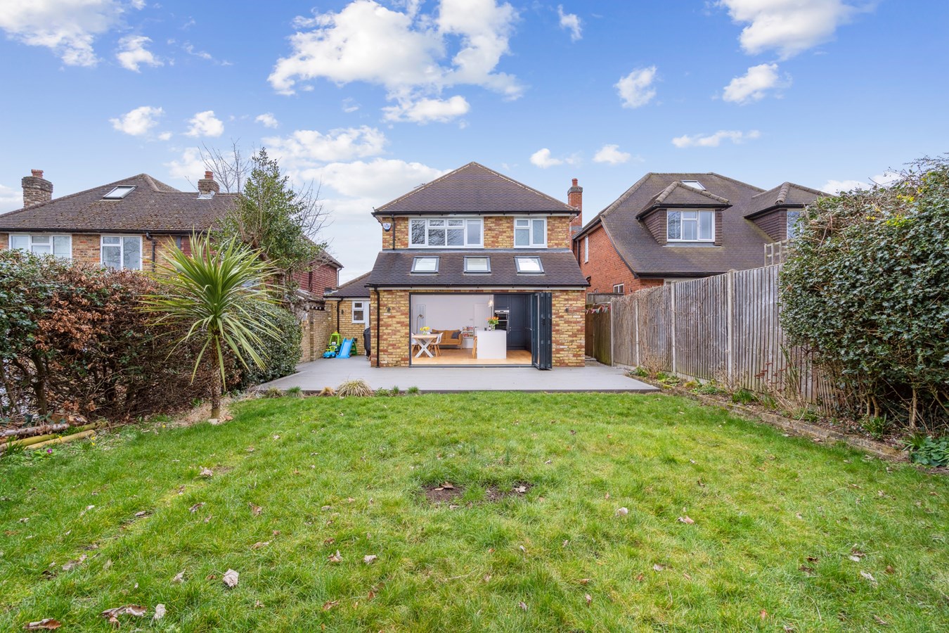 The private rear garden is mainly laid to lawn with composite decking area, plus pergola with seating area at the end of the garden.