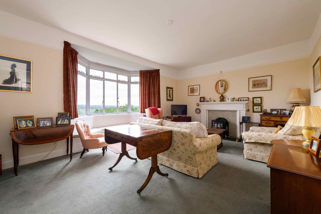 - Bright drawing room featuring a large bay window with southerly views of the garden and an open fireplace.