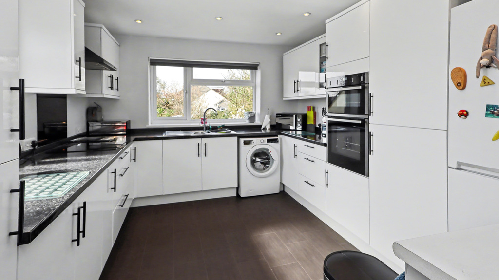 • Extended kitchen fitted with modern units, integrated appliances including double oven and induction hob, with dual aspect windows
