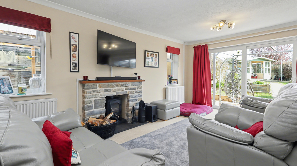 • Sitting room with patio doors opening onto the rear garden and feature stone fireplace with multi fuel stove