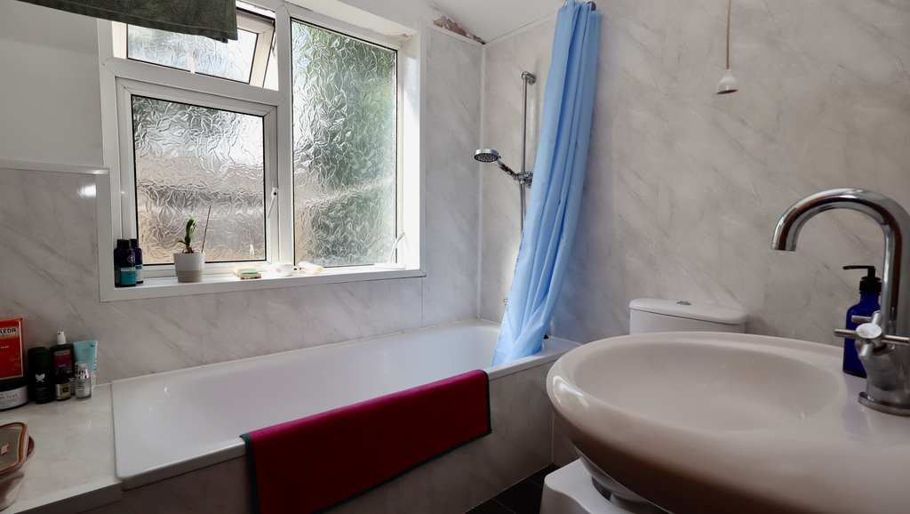 - Off the kitchen is a rear hallway and useful utility room with space and plumbing for appliances, with a door leading to the family bathroom with toilet, basic and bath with shower over.