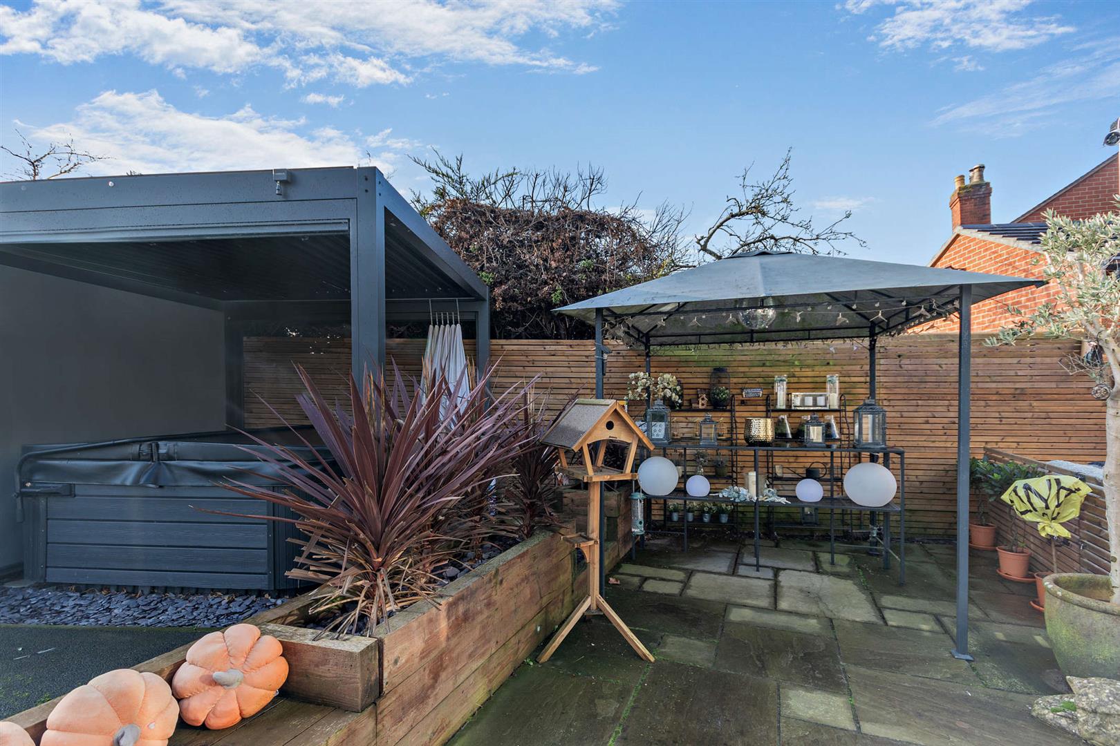 To the side and rear there is a paved patio area providing a delightful seating area and the entertaining space. The private garden is primarily laid to lawn with outside lighting, outside tap and cameras and is all enclosed by a combination of timber panel fencing and mature hedging. There is also a utility unit housing a fridge/freezer, tumble dryer and has rubber mat flooring.