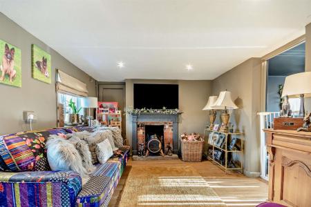 Lounge - 4.57m x 4.57m (14'11" x 14'11") - Power points, radiator, door into large storage cupboard, upvc double glazed French doors and matching side panels onto the side seating area, opening through to: