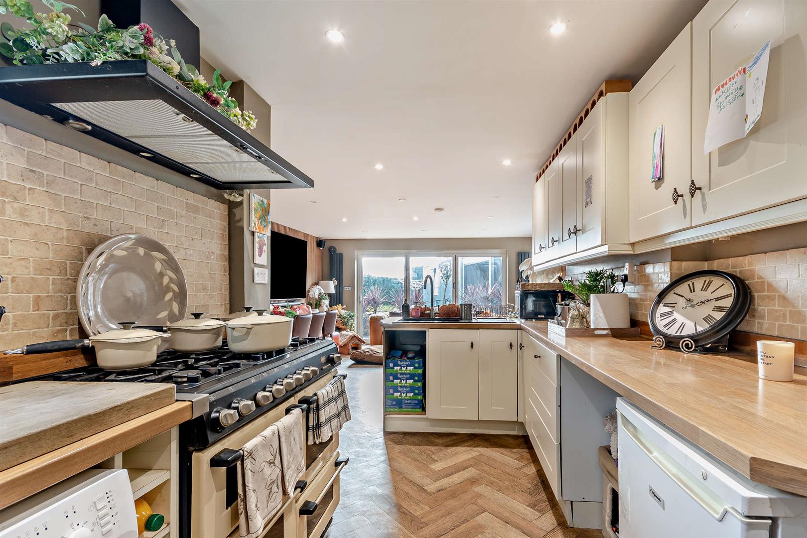 Kitchen/Dining/Family Room - 8.84m x 4.88m (29'0" x 16'0") - Power points, modern wall mounted radiators, herringbone laminate wood flooring, upvc bifold doors overlooking the private rear gardens, upvc double glazed patio doors to the side garden and seating area.