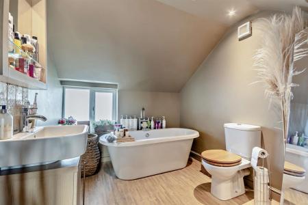 En-Suite Bathroom - Modern white suite comprising a wall mounted wash hand basin with a vanity unit below, roll top bath with mixer taps, close coupled w.c., chrome heated towel rail, upvc double glazed opaque window to front aspect.