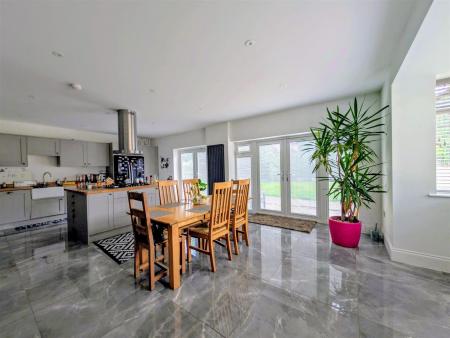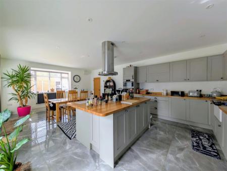 Kitchen/Diner/Family Room - 7.39m x 4.72m max (24'3 x 15'6 max) - A range of base and wall mounted units, oak worktops, Belfast style sink unit with a mixer tap, built in washing machine, tumble dryer, dishwasher and electric double oven, space for an American style fridge/freezer, Island unit housing a five burner gas hob with extractor hood over with drawers and cupboards, cupboard housing the gas fired combination boiler, double designer radiators, marble floor, downlighters, upvc double glazed bay window to front elevation, matching French doors to side elevation onto the patio.
