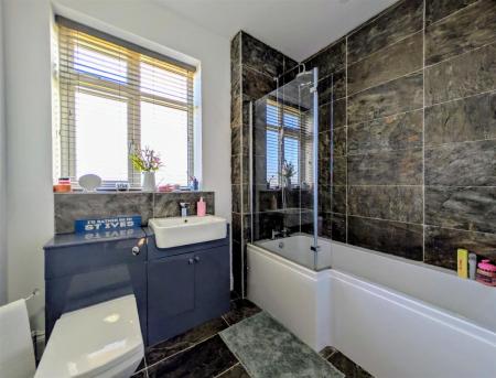 Family Bathroom - 2.51m x 1.88m (8'3 x 6'2) - White suite comprising panelled bath with a mixer tap and Mira Realm shower over, low level w.c., wash hand basin with a mixer tap and cupboard below, partially tiled walls, natural stone slate tiled floor, towel radiator, downlighters, extractor fan, upvc double glazed window to rear elevation.
