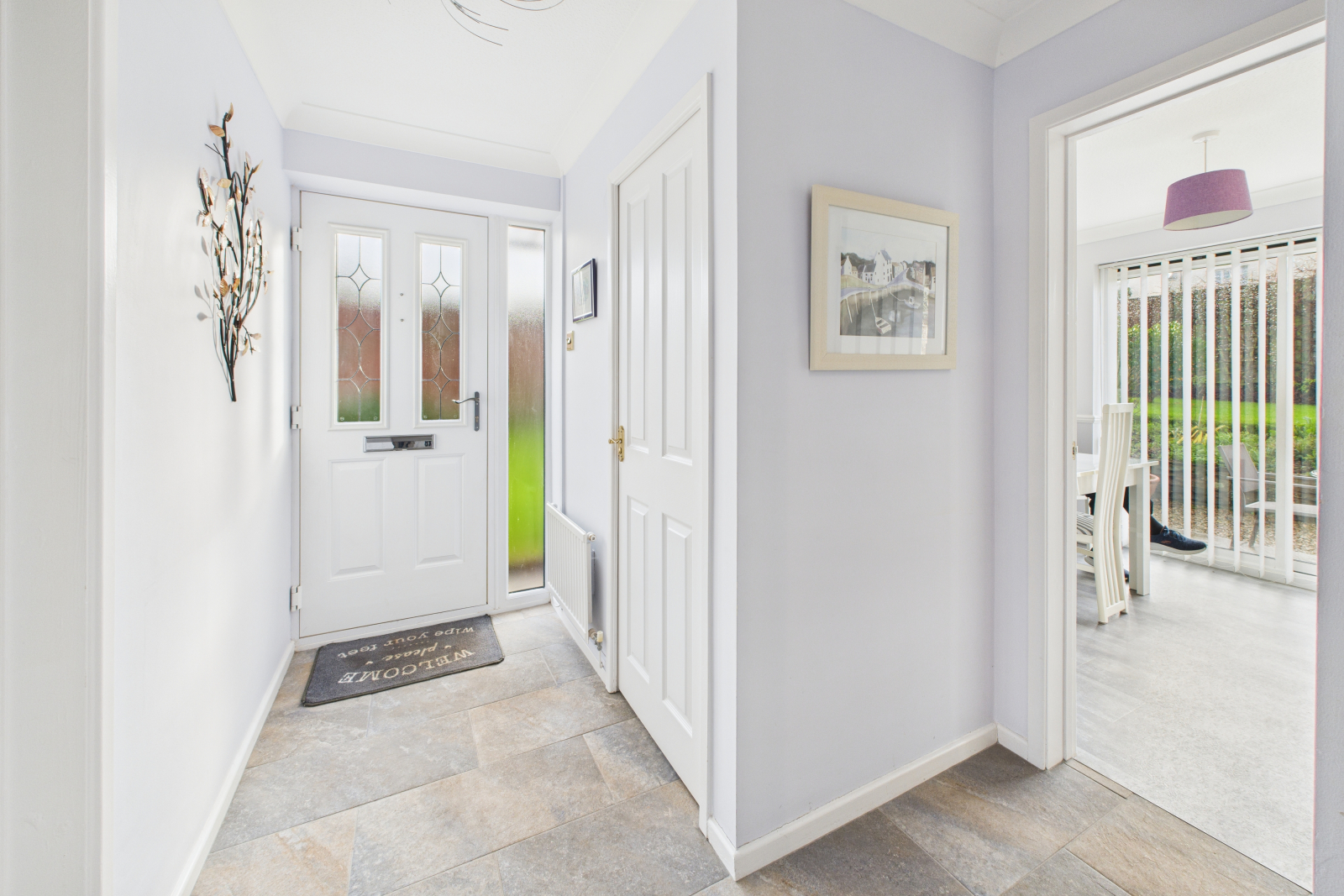 Large, bright entrance accessed from the side of the property. UPVC door with obscured glazed panels and an obscured floor-to-ceiling window to the side. Stone-tiled flooring, wall-mounted radiator, central lighting, and a coat nook with low-level shelving for shoes. Doors leading to the dining area, lounge, and integral garage.
