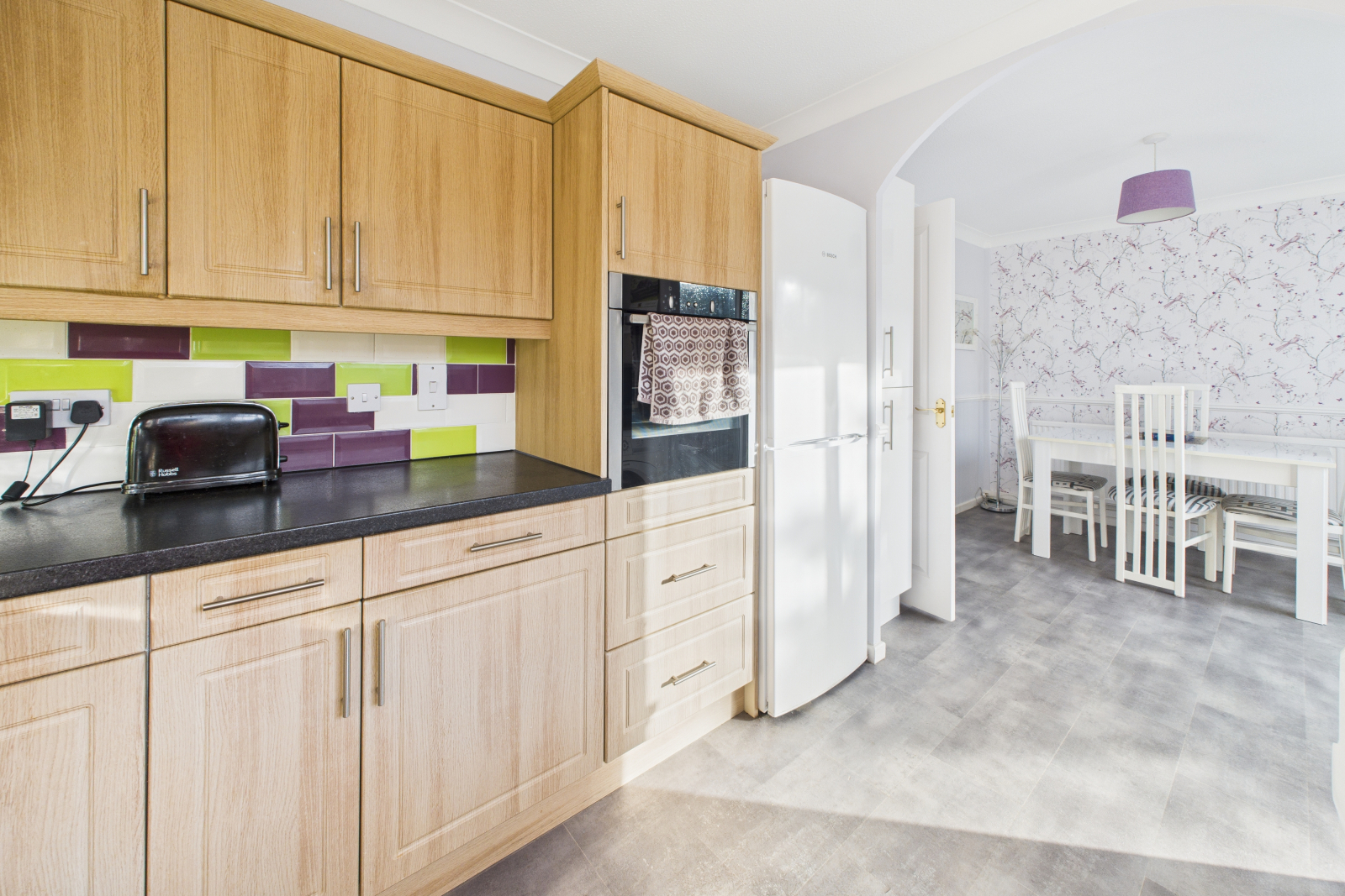 Tile-effect vinyl flooring, UPVC double-glazed window to the side aspect, boiler location, a range of eye-level and base units, power points, space for fridge freezer, dishwasher and washing machine, 4-ring gas hob, integral oven, and sink with drainer and mixer tap.
