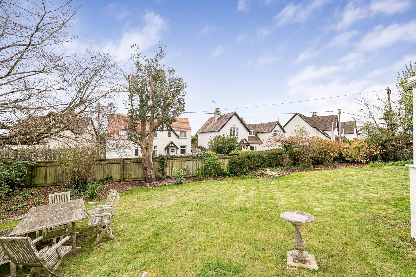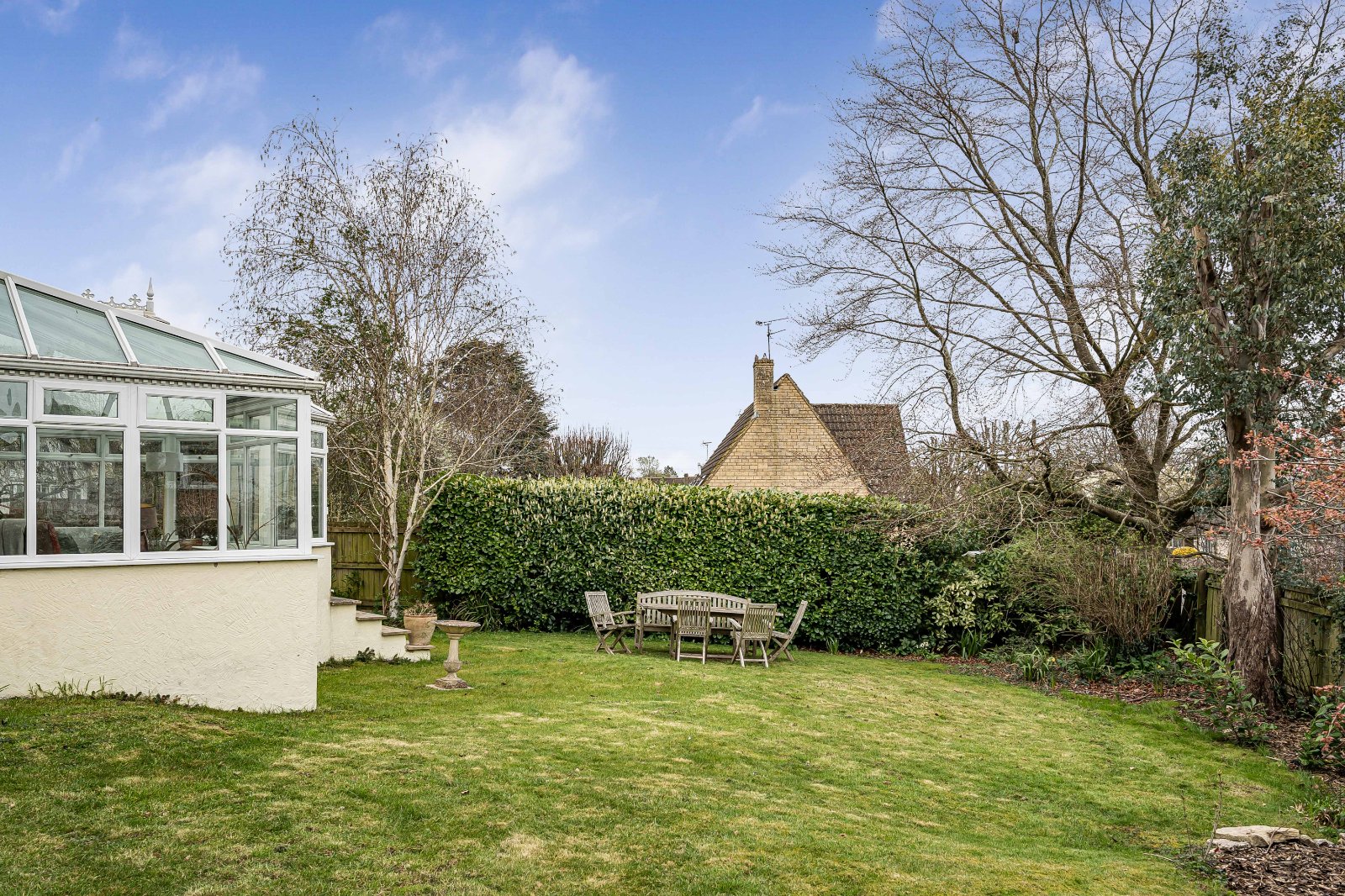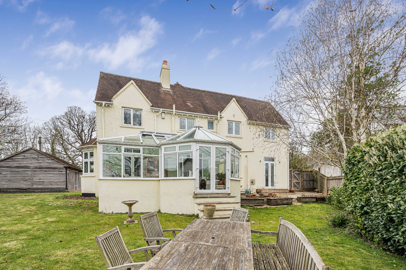 The property is set within established gardens, predominantly laid to lawn, providing a private and secure setting. A decked terrace to the south side of the house offers an ideal space for outdoor dining and entertaining, with direct access to the garden.
