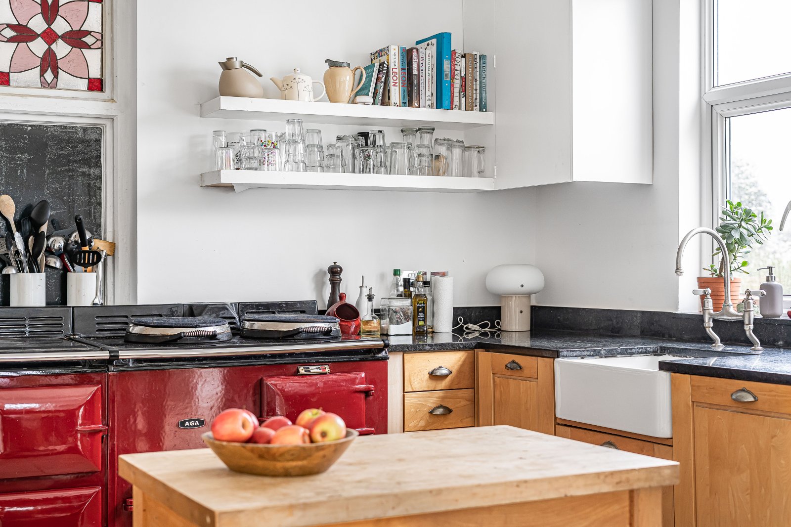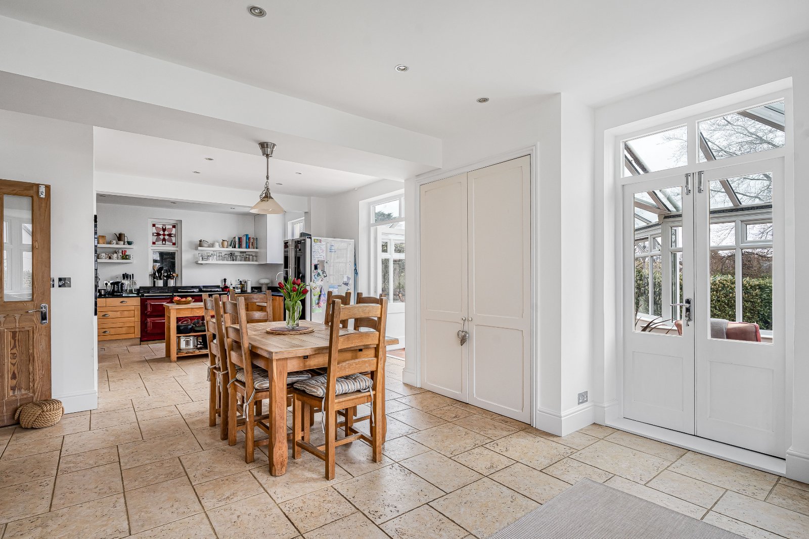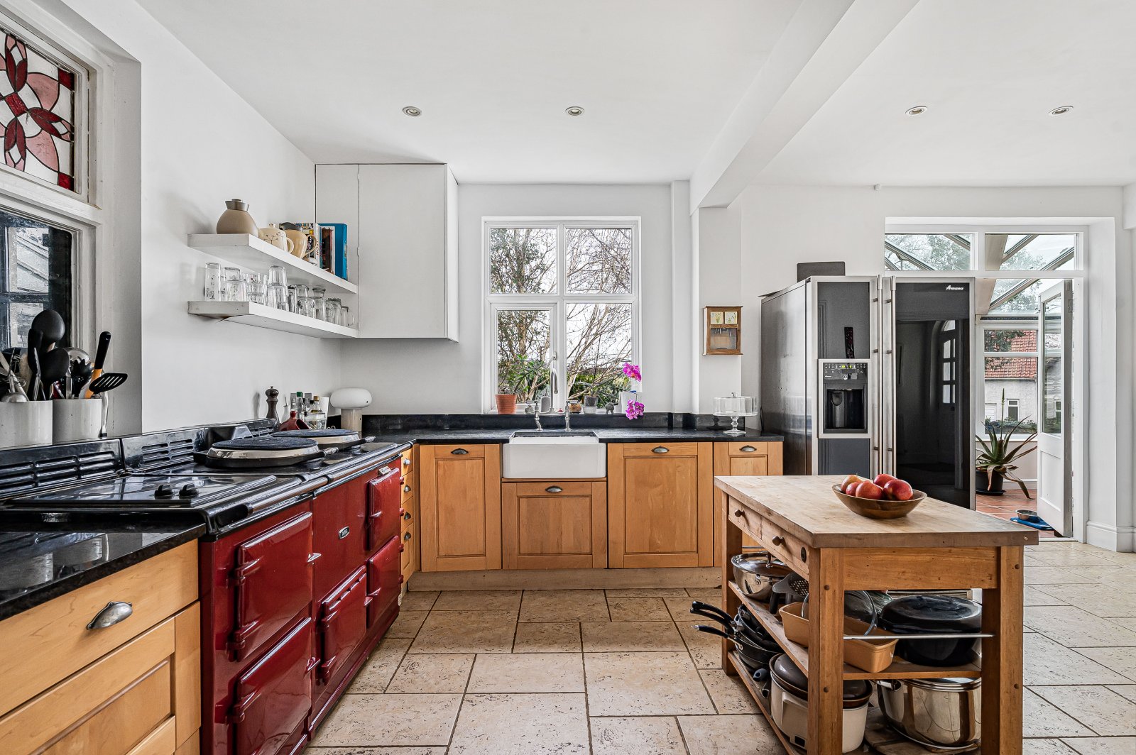 The kitchen is comprehensively fitted with a range of farmhouse-style units, centred around a four-oven Aga, alongside additional integrated appliances, granite work surfaces and a Butler sink. A walk-in larder and space for an American-style fridge/freezer further enhance the practicality of this space.
