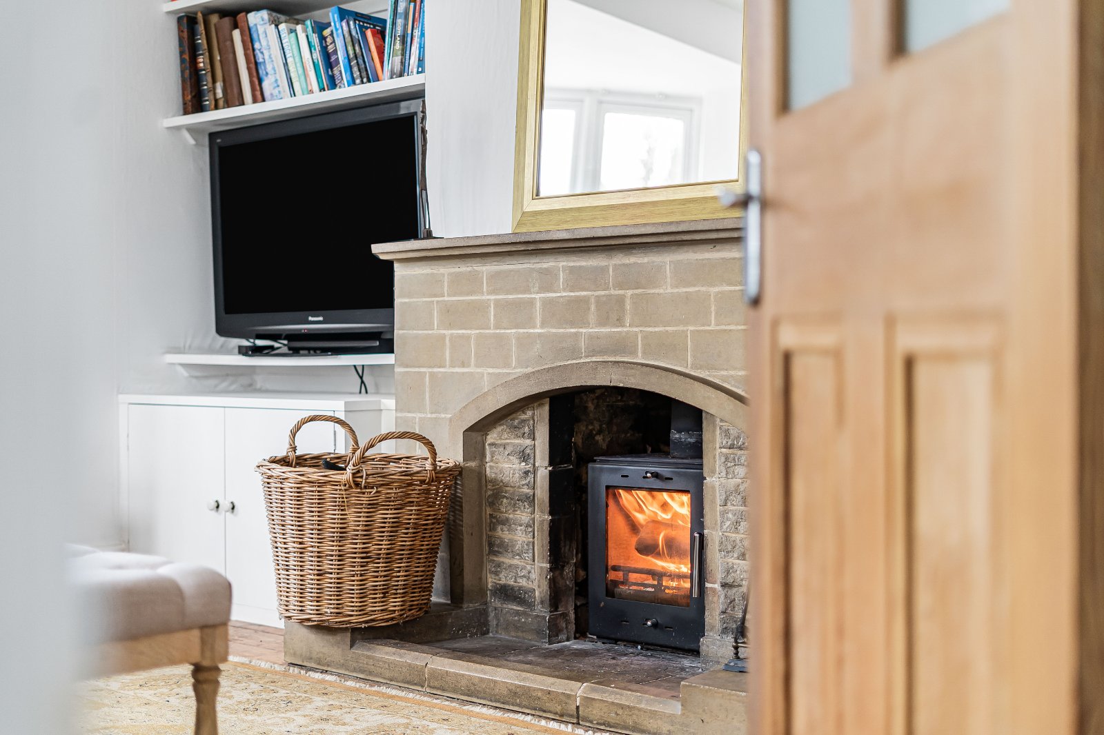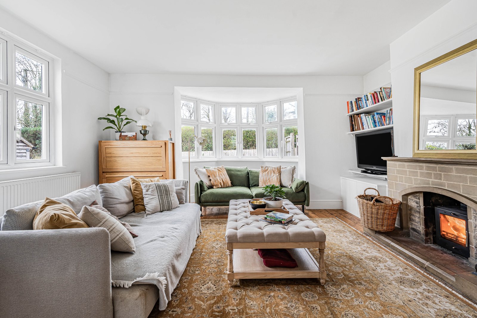 A formal sitting room lies to the side, benefitting from a dual aspect including a beautiful bay window, complemented by stripped wooden floorboards and a stone fireplace with multi-fuel stove. Of particular note is the impressive open-plan kitchen/dining/family room, designed to create a sociable and functional living space, with flagstone flooring throughout.