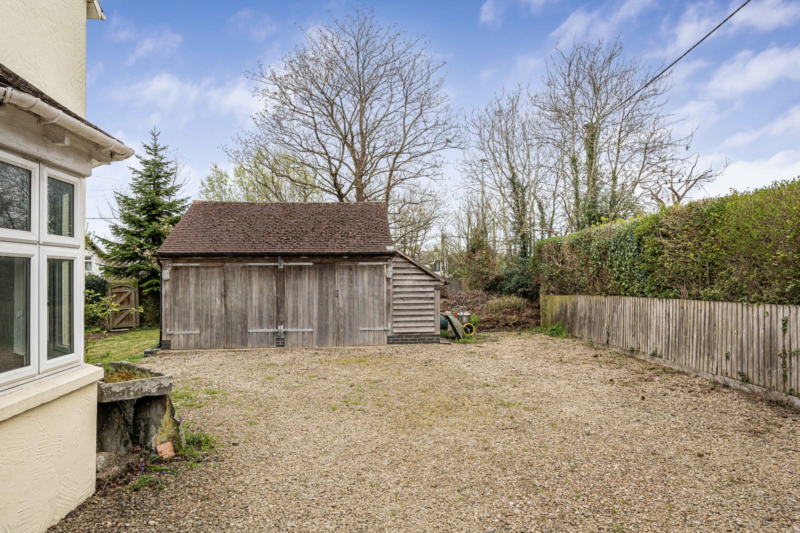 A gravelled driveway provides parking to the front, with gated access leading to further parking and a detached double garage positioned to one corner of the plot. Additional space is available for the storage of a boat or motorhome, offering further versatility.