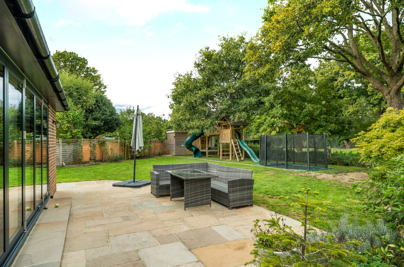 - Large landscaped rear garden with lawn, terrace, and children's play area