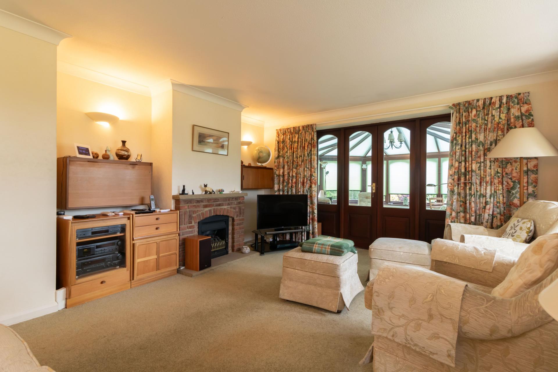 Upon entering the property, you are welcomed by a spacious entrance hall, currently utilized as a dining area by the vendors. The kitchen, generously sized and offering lovely views over the fields, adds to the home's charm. The large lounge extends into a conservatory, providing direct access to the mature gardens, perfect for relaxation and outdoor entertaining.