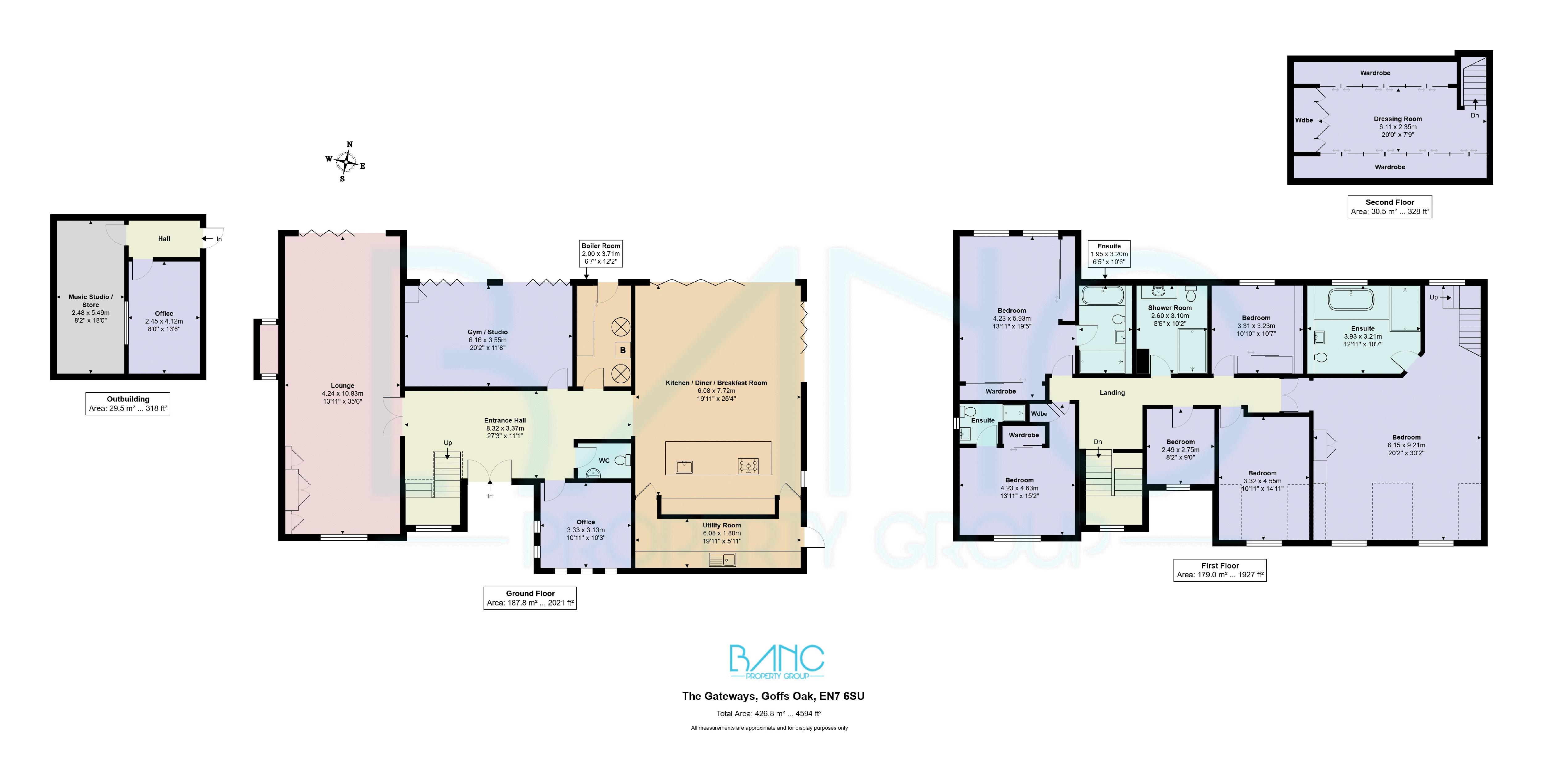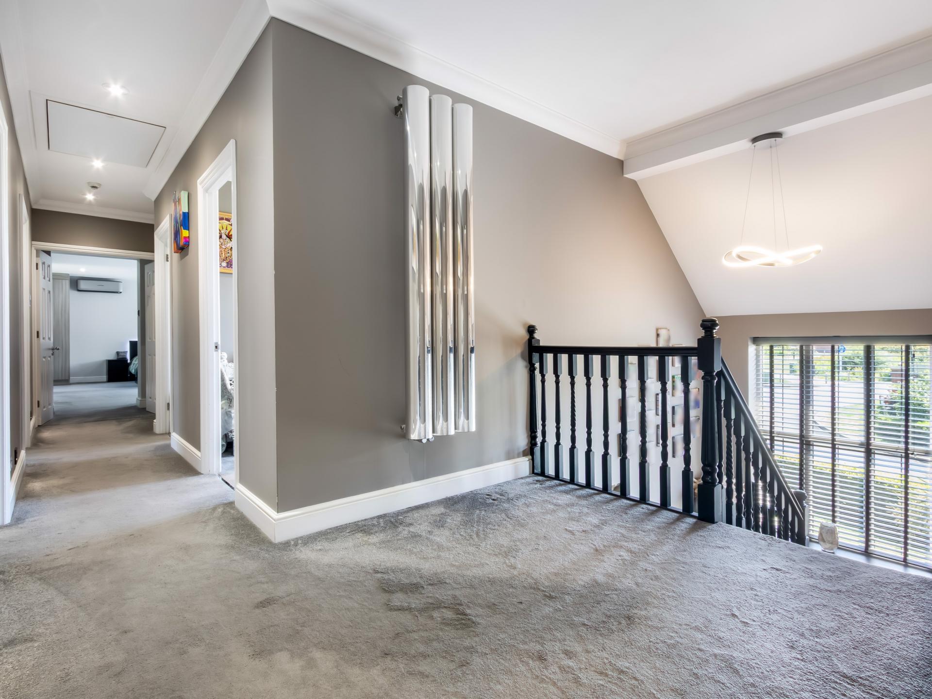 Six generously sized bedrooms are arranged across the first floor include three with en-suite bathrooms and a stylish family bathroom. The principal suite is enhanced by a magnificent dressing room, accessed via a private staircase leading to the second floor.