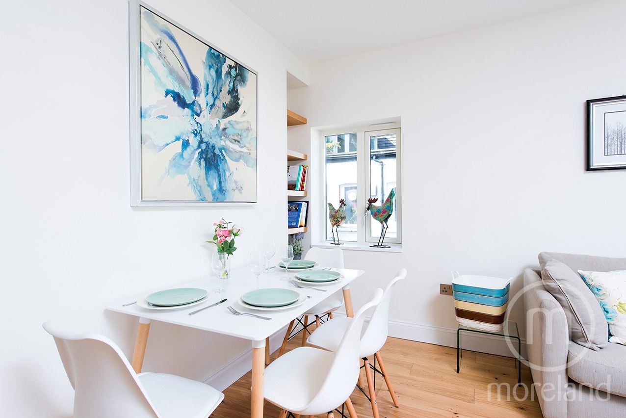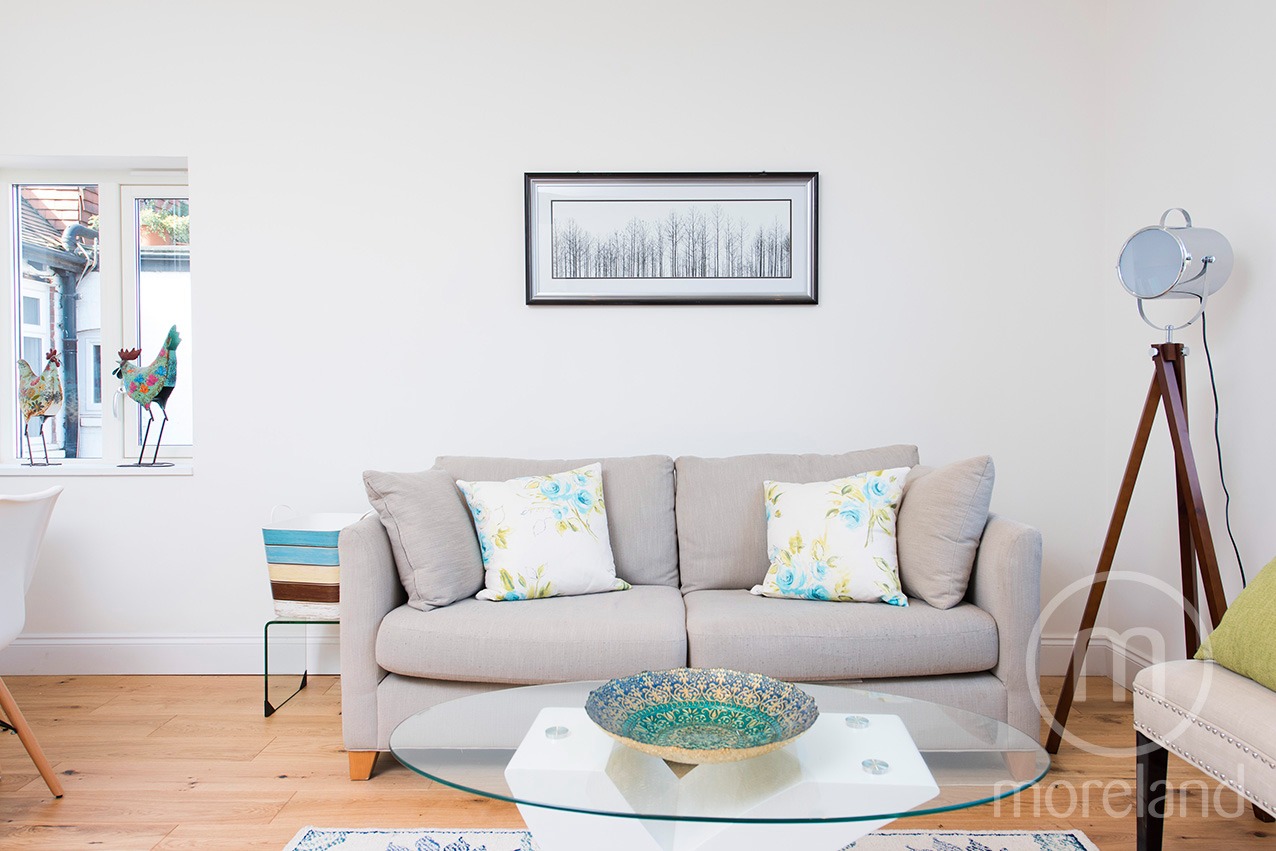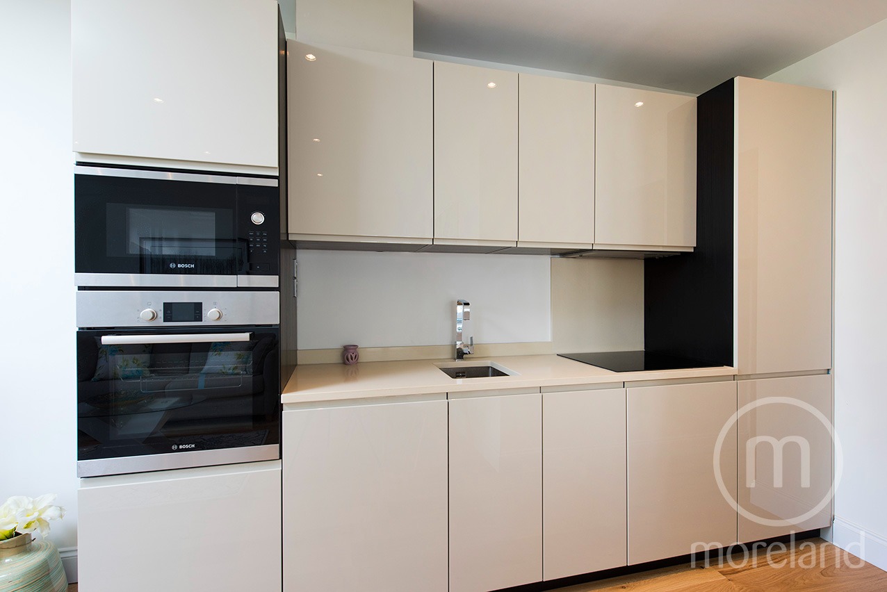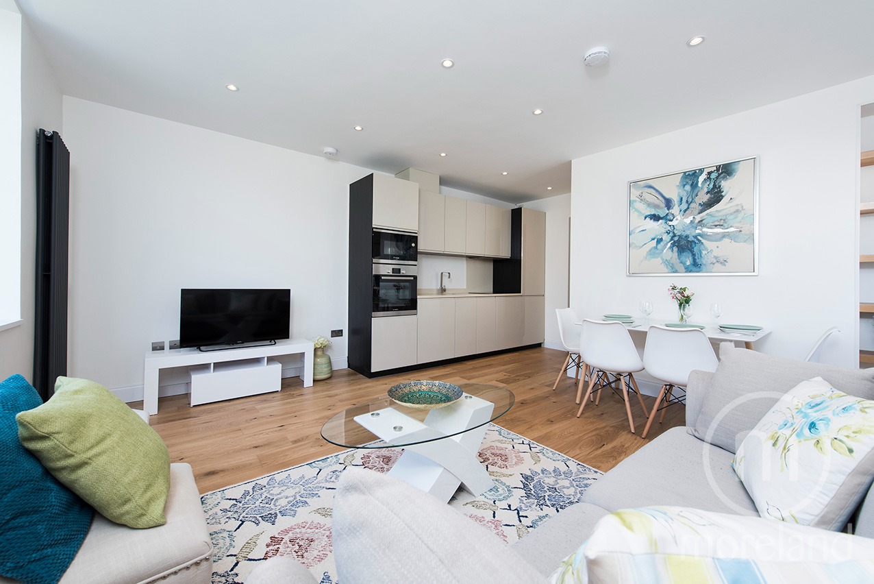 Comprising communal hallway with stairs rising up to the first floor door to apartment reception room with open plan space saving kitchen with integrated appliances.