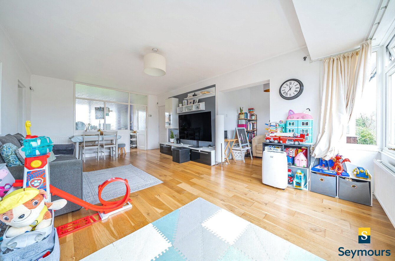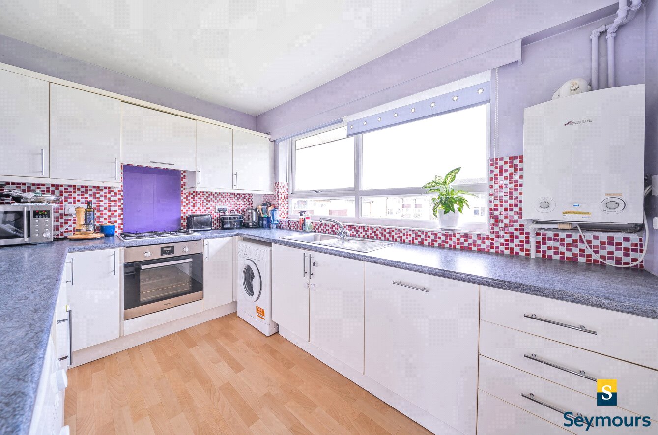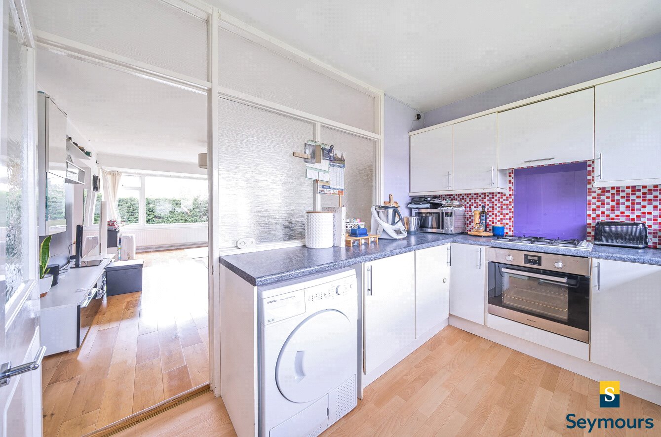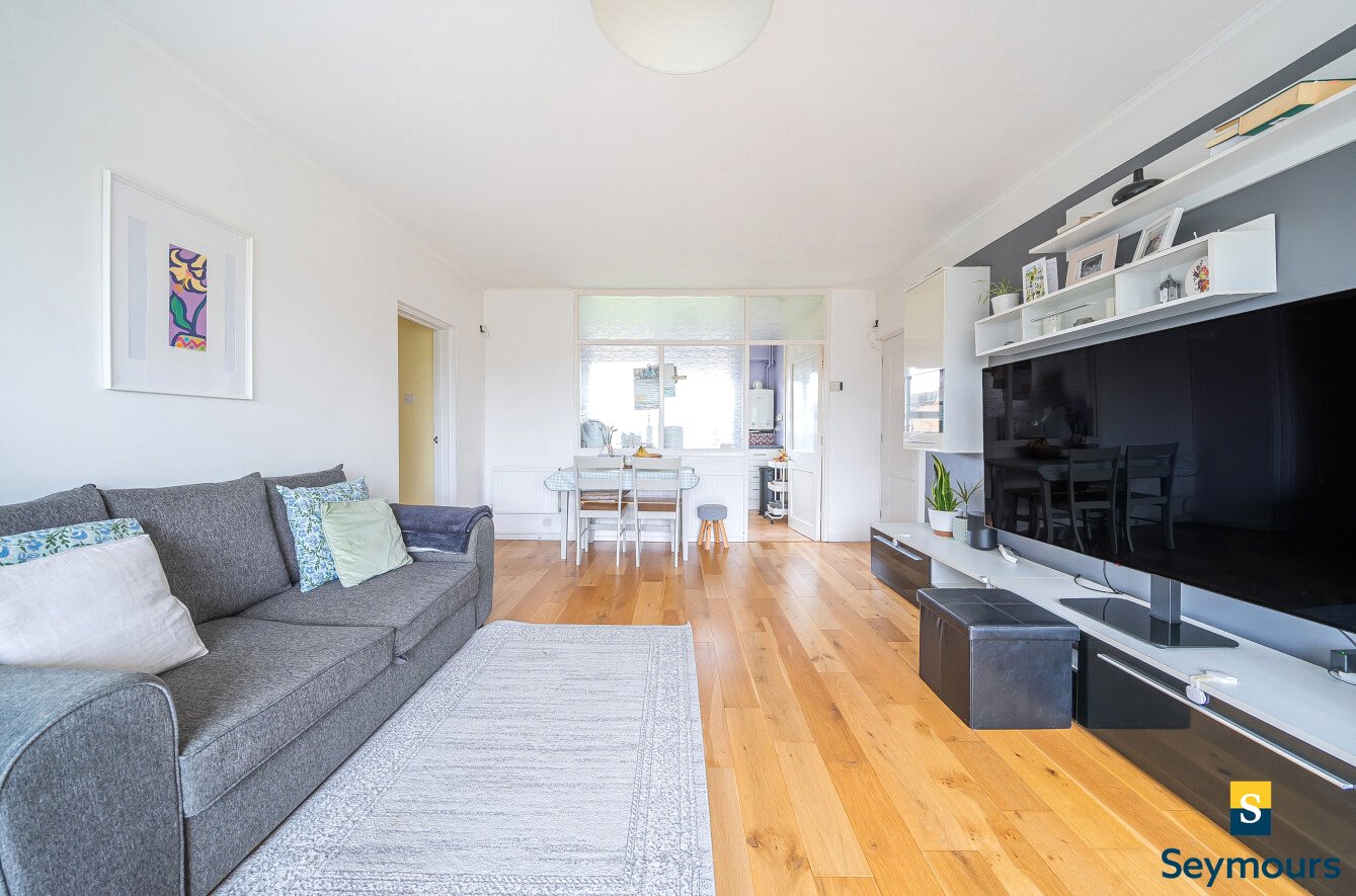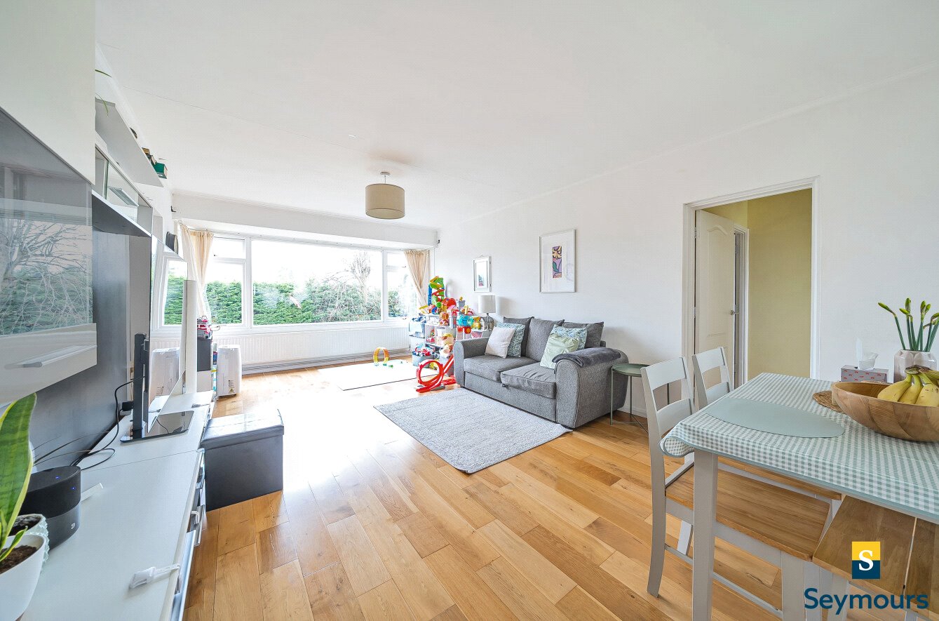 The bright reception room boasts engineered oak flooring, a large front-facing window with views of the communal gardens, and a study nook. The modern kitchen at the rear includes ample fitted units, a built-in hob, oven, and dishwasher, plus space for additional appliances.