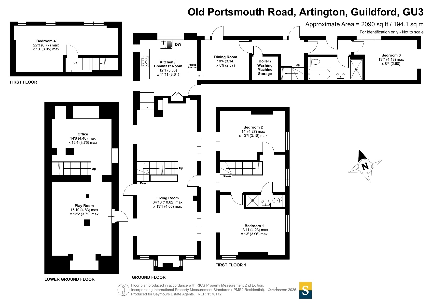 The bespoke kitchen/breakfast room is fitted with shaker-style cabinetry, a farmhouse sink, high-end appliances, and underfloor heating, framed by terracotta floor tiles that nod to the home's heritage. The adjoining dining room enjoys garden views and easy access to the outside terrace, ideal for summer dining. The ground floor also includes a well-proportioned third bedroom and a family bathroom, while the lower ground floors offer a versatile playroom and an office, perfect for remote working or additional reception use.