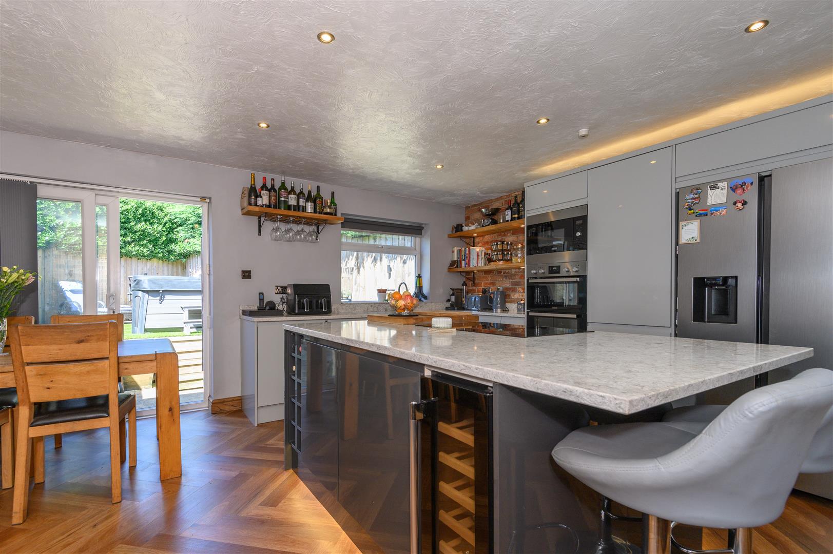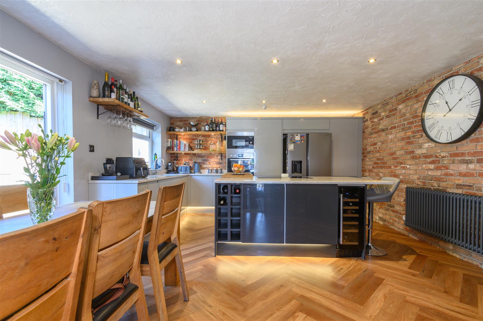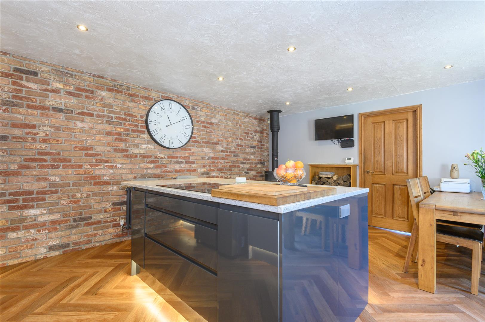 - Striking kitchen with exposed brick, granite worksurfaces and chevron wood floors