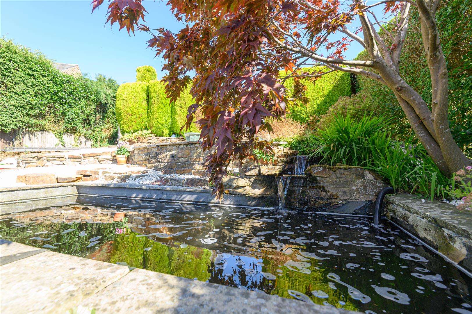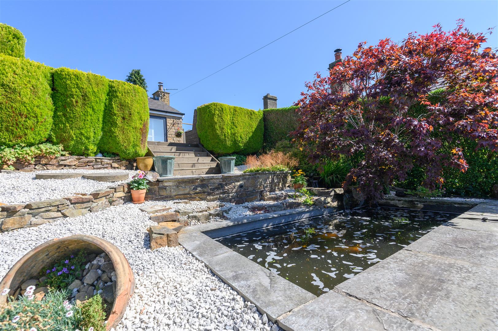 - South-facing front garden with koi pond and Japanese-inspired landscaping