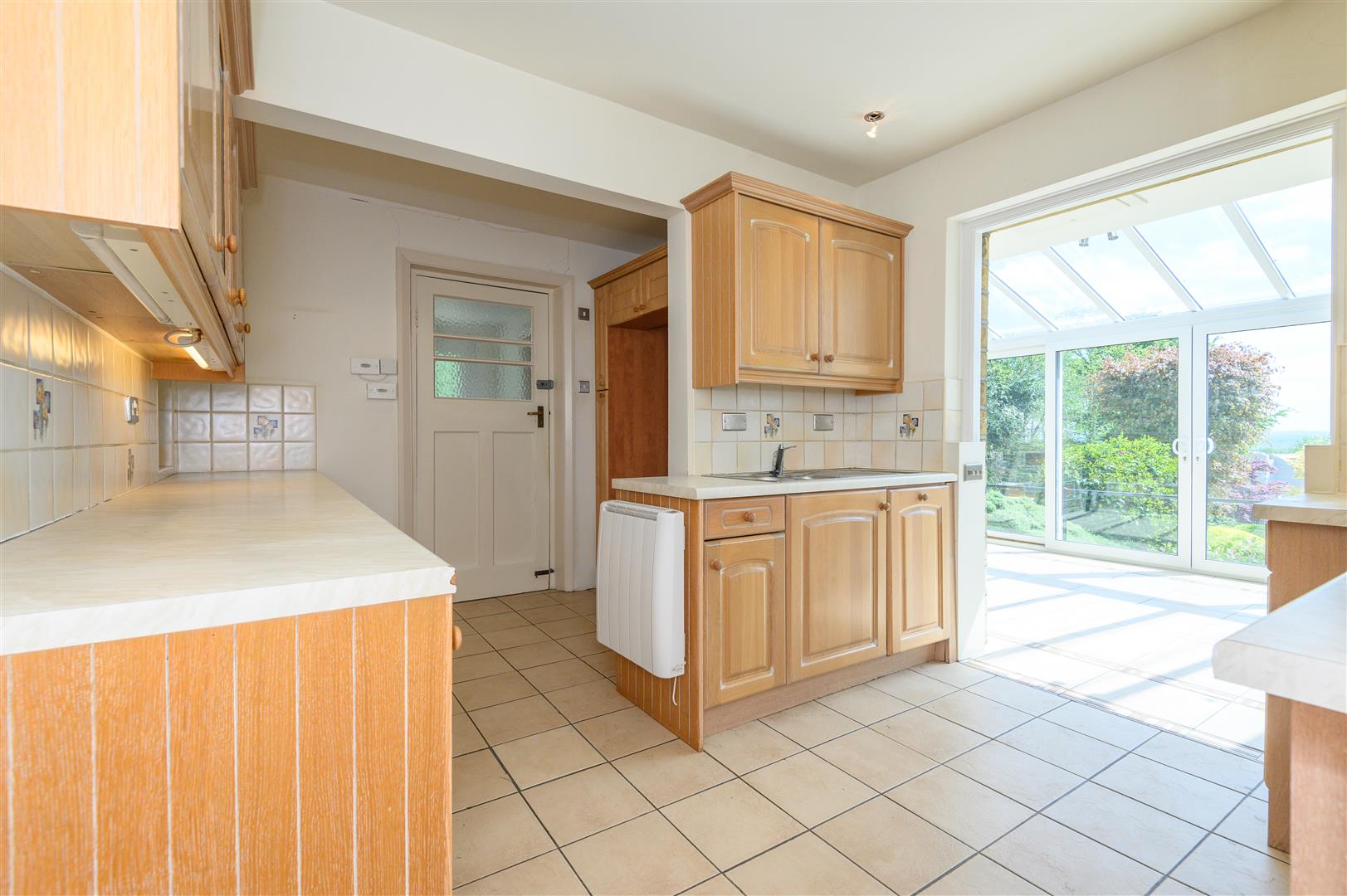 The kitchen features wooden base, drawer, and wall units paired with contrasting worktops and a Kenwood oven and hob. An open archway leads through to the conservatory, where exposed stonework and sliding glass doors bring the outdoors in.