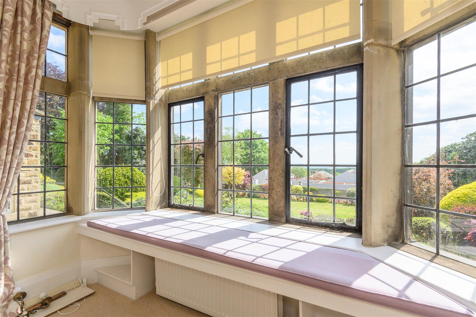 The main living room is a standout space, complete with a gas fireplace framed by a marble surround and Adams-style mantle. Stone mullioned bay windows offer a built-in seat, and frame sweeping views stretching as far as Emley Moor Mast.