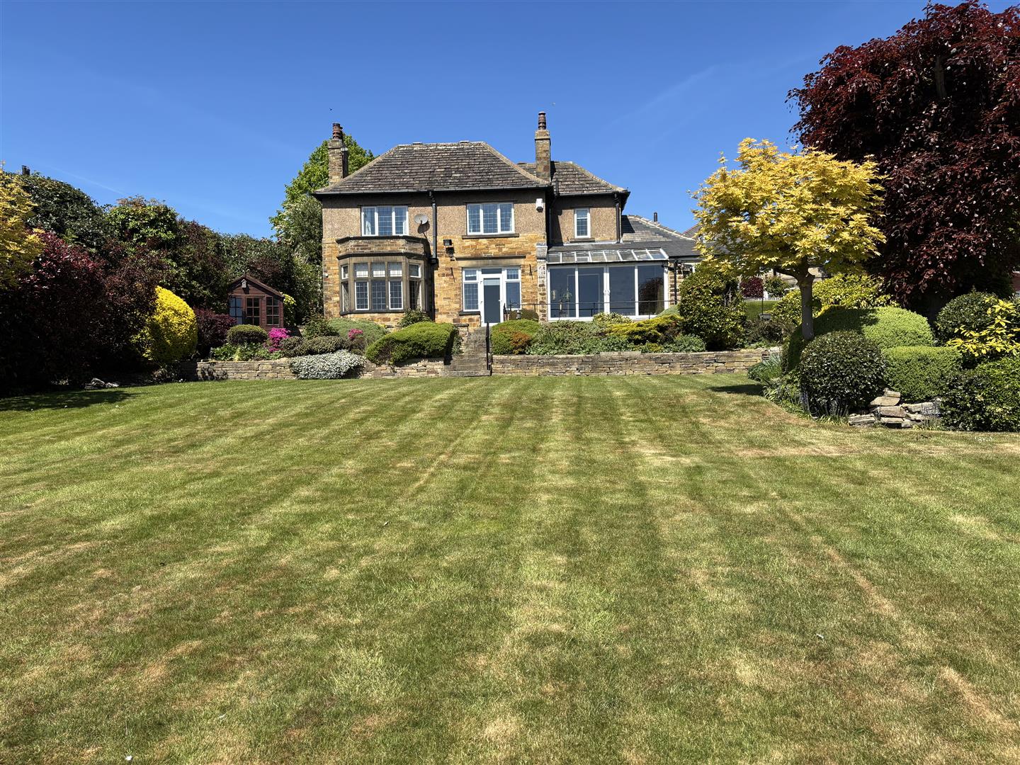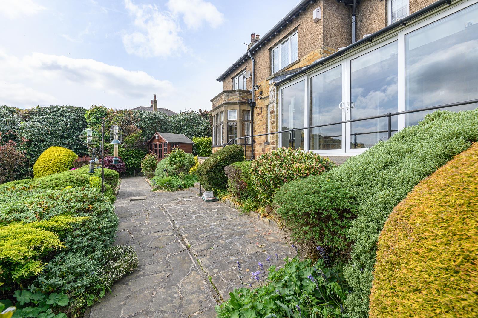 The south-facing rear garden is a real highlight - a generous, tiered outdoor space with lawn, established beds and shrubbery, and a stone pathway winding through. A garden shed provides extra storage for tools or outdoor toys.