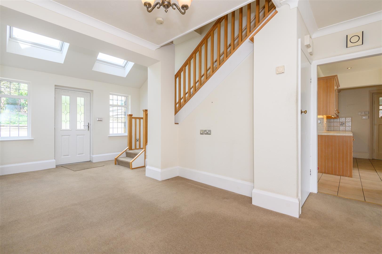 A spacious and welcoming entrance hall with skylights sets the tone for this light-filled home.