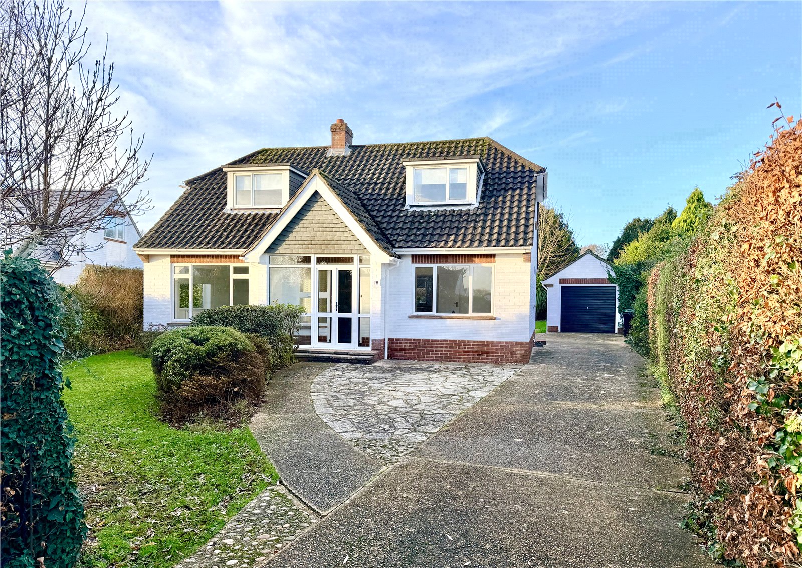 To the front the property is approached via a driveway providing ample off street parking, the front boundary is mature hedge with lawn beyond and established beds and borders.