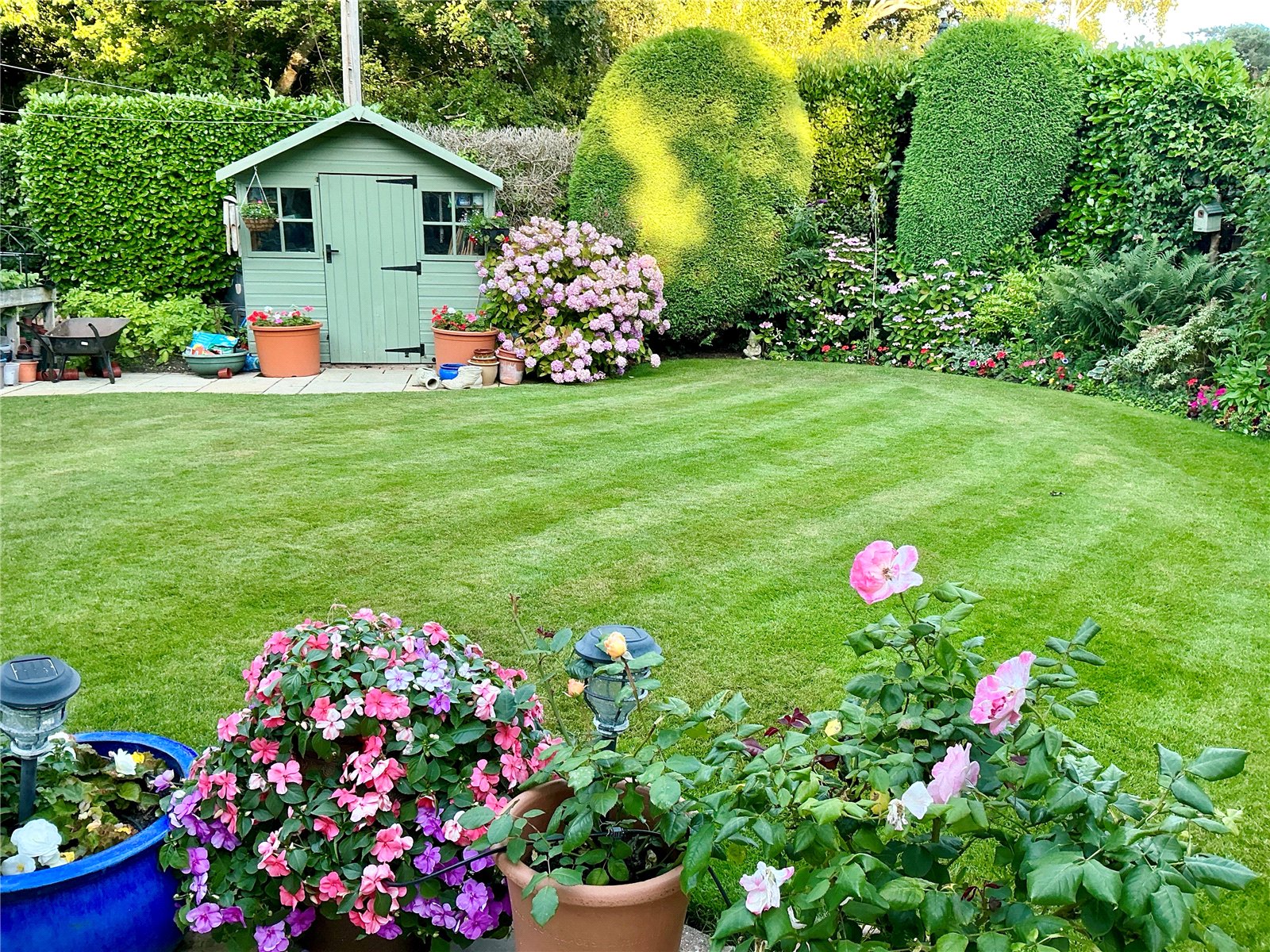 The front driveway provides ample parking and access to a large Garage which has stairs to a storage area on the first floor, there are gates on either side of the property which provide access to the rear garden which has a southerly aspect, flanked by mature trees with a good size terrace which leads onto lawn with established beds and borders. There is also a useful garden shed as well as a greenhouse.