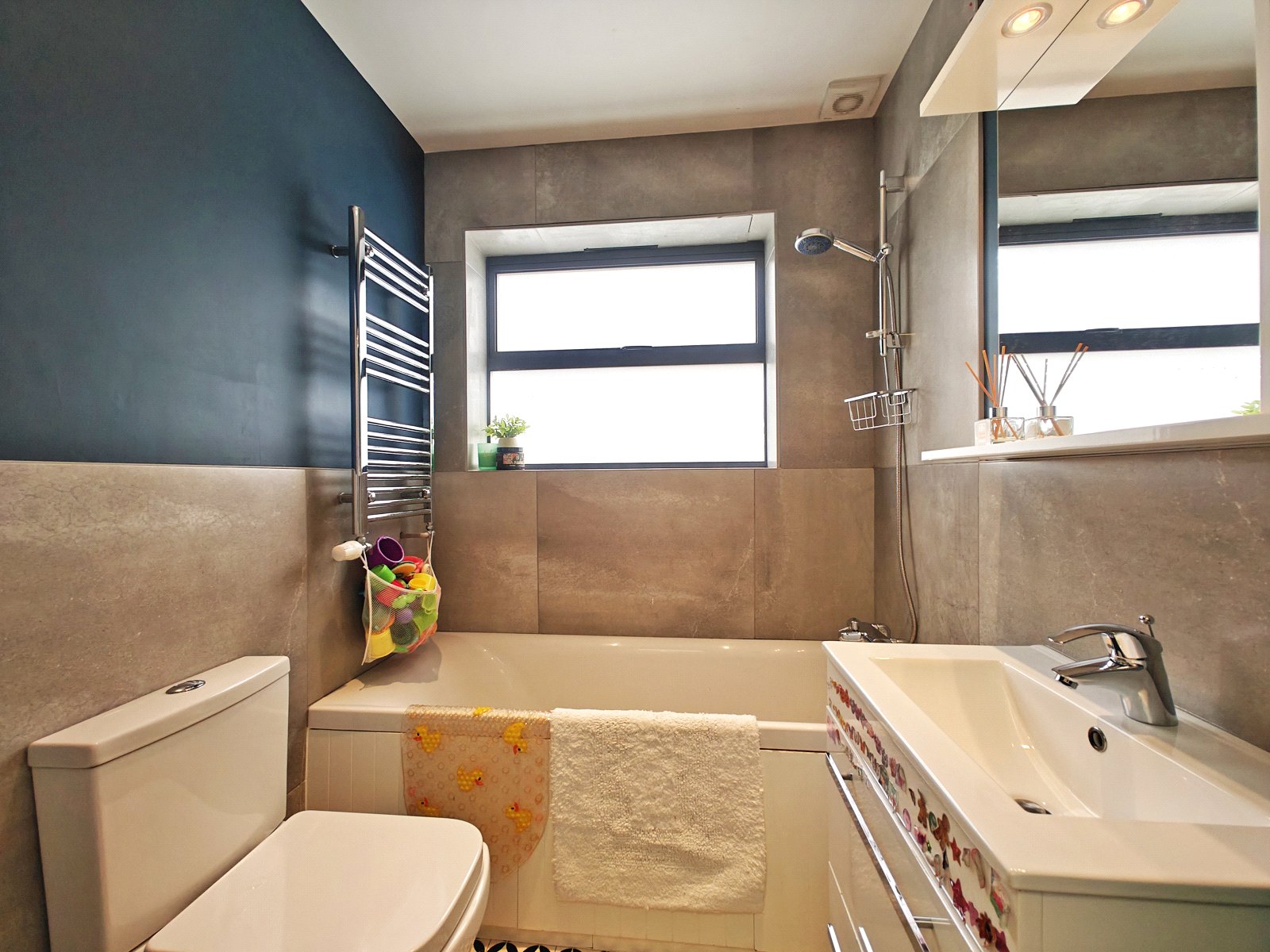 * Family Bathroom: A luxury bathroom serves the upper floor, featuring contemporary stone-effect tiling, a recessed vanity unit, heated towel rail and premium chrome fixtures.