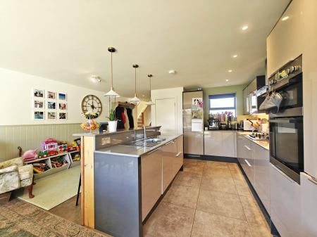 * Architectural Kitchen/Diner: The heart of the home is the stunning rear extension. It features handleless cabinetry in a soft flint gray, integrated appliances including a five-ring gas hob and double oven, fridge/freezer, dishwasher, gas fired central heating boiler and a striking wooden-clad island with pendant lighting. There is a further cupboard housing washer and dryer. Wood panelled walls. Full width floor to ceiling patio doors which frame the garden perfectly, creating a seamless connection to the outdoor terrace.