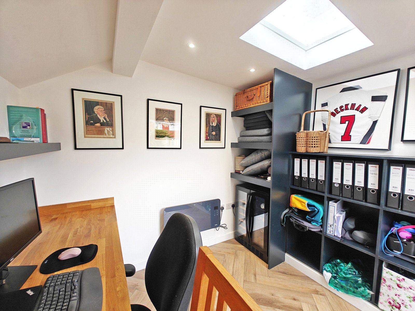* Garden Office/Workspace. A versatile room, currently used as a two person office, with fitted oak desk, radiator, sky light, double glazed window and door, multiple sockets, high speed Ethernet port, built in shelves and storage and luxury vinyl tile flooring.
