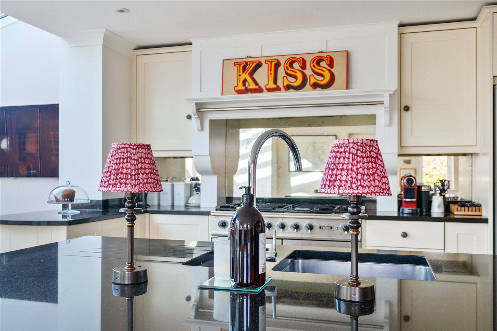 Kitchen/Breakfast Room Large family kitchen/breakfast room with glazed side extension complete with space for table. Beautifully fitted kitchen incorporating a comprehensive range of painted wooden units at base and eye level with granite worktops. Matching island unit with 1 1/2 bowl stainless steel sinks and drinking water tap. Gas fired Falcon range cooker with electric ovens and extractor over. Range of integrated appliances including Bosch dishwasher, wine fridge and microwave. Hard wired Bluetooth enabled amplifier system in ceiling. Double doors to rear terrace and garden and separate single door to side. Underfloor heating (2 zones).