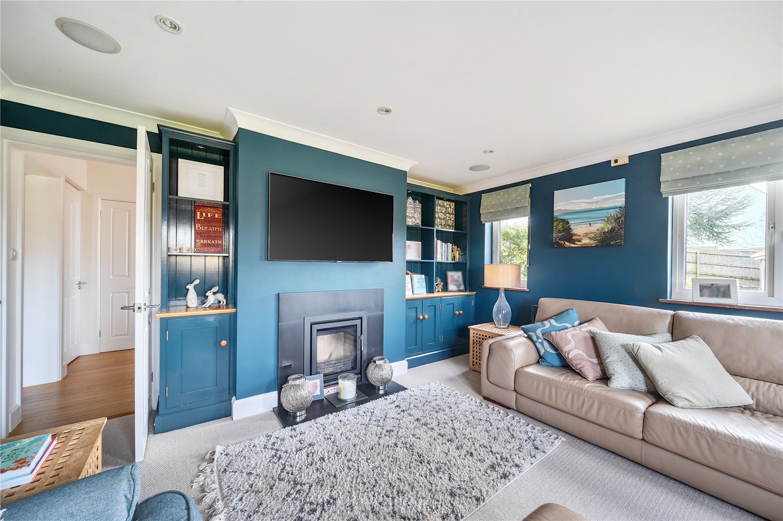Snug Fitted bookcases with integral lighting. Woodburner with TV point over. Bluetooth amplifier system.