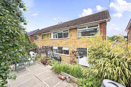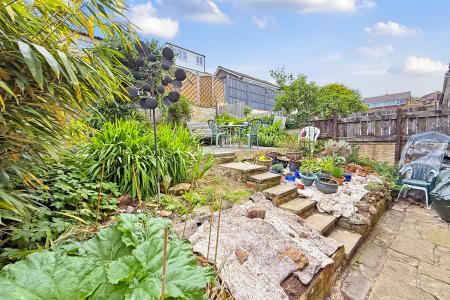 OUTSIDE A driveway provides off-street parking to the front of the single garage, housing the boiler, with grassed area and planted borders. Side access leads to the tiered rear garden, which includes a patio area, rockery, flower beds, and a raised flagged terrace, ideal for outdoor seating and entertaining.