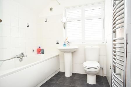 White suite comprising panelled bath with shower over and glazed screen, pedestal washbasin, low-level WC, tiled walls, chrome heated towel rail, extractor fan, and built-in storage cupboard. uPVC double-glazed window to side elevation.