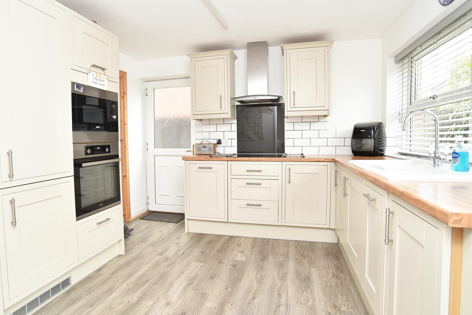 A modern fitted kitchen with a range of stylish wall and base units and work surfaces over. Inset porcelain sink unit with mixer tap, integrated ceramic hob with extractor hood above, built-in oven and microwave, and integrated fridge, freezer, and dishwasher. Cupboard and under-stairs storage. UPVC double-glazed window to the rear and glazed door providing access to the side and garden. Internal door to the garage with utility area.