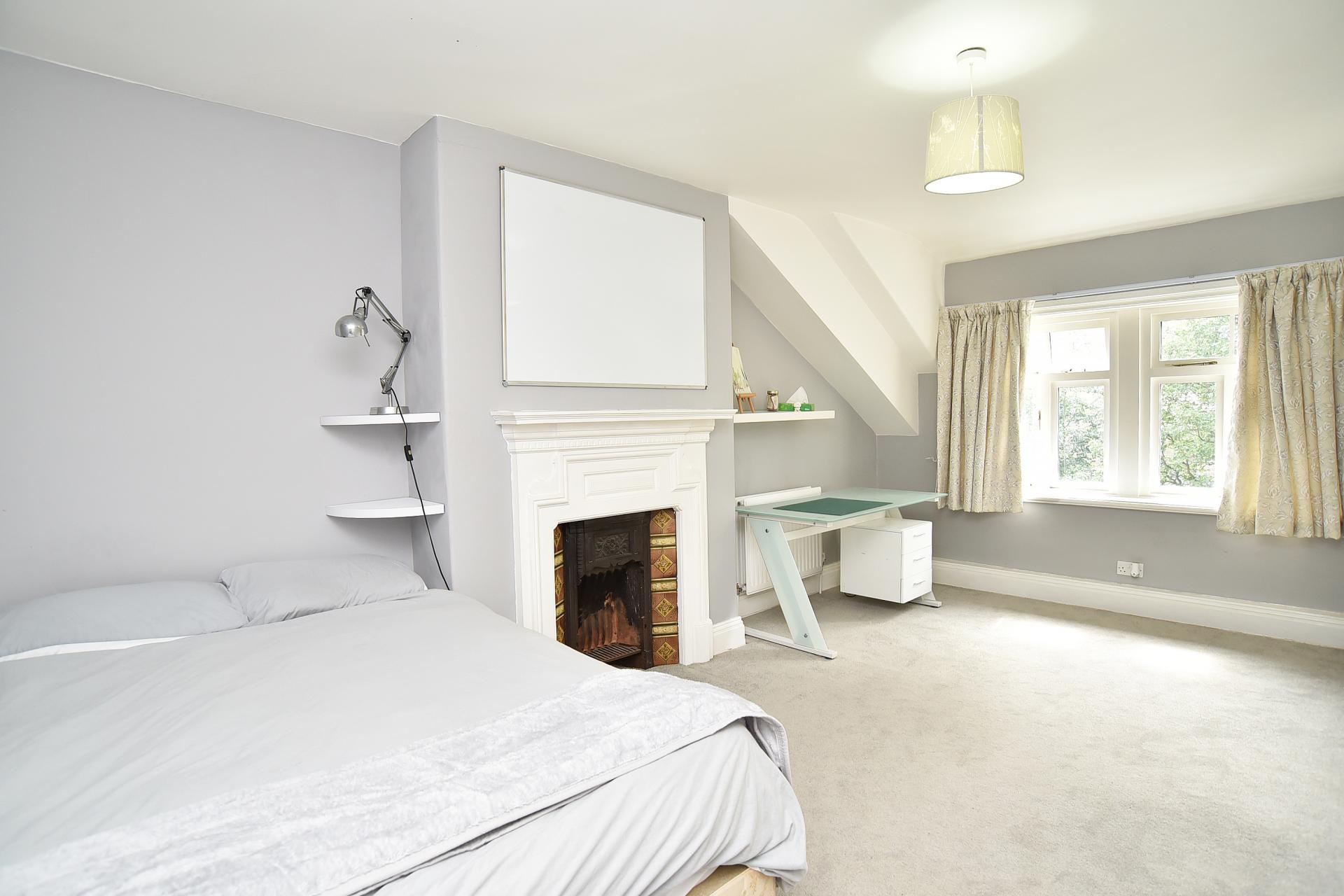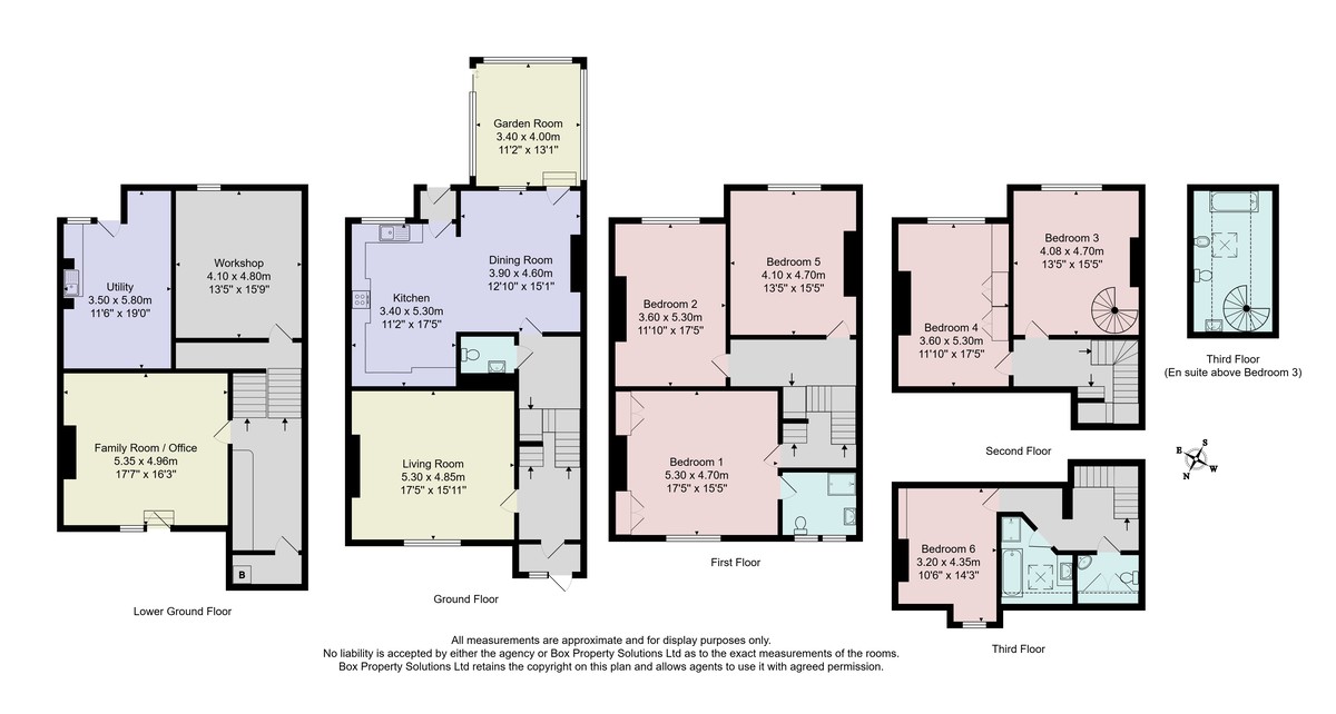 The six generous double bedrooms are arranged across the upper three levels, including the principal bedroom with built-in storage and modern en-suite shower room. One further bedroom features a stylish en-suite bathroom on the level above it, accessed via a private spiral staircase, while the fourth floor has a contemporary family bathroom and a separate WC.