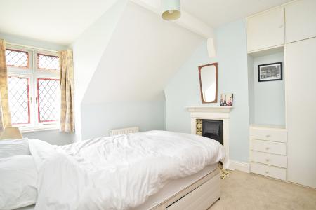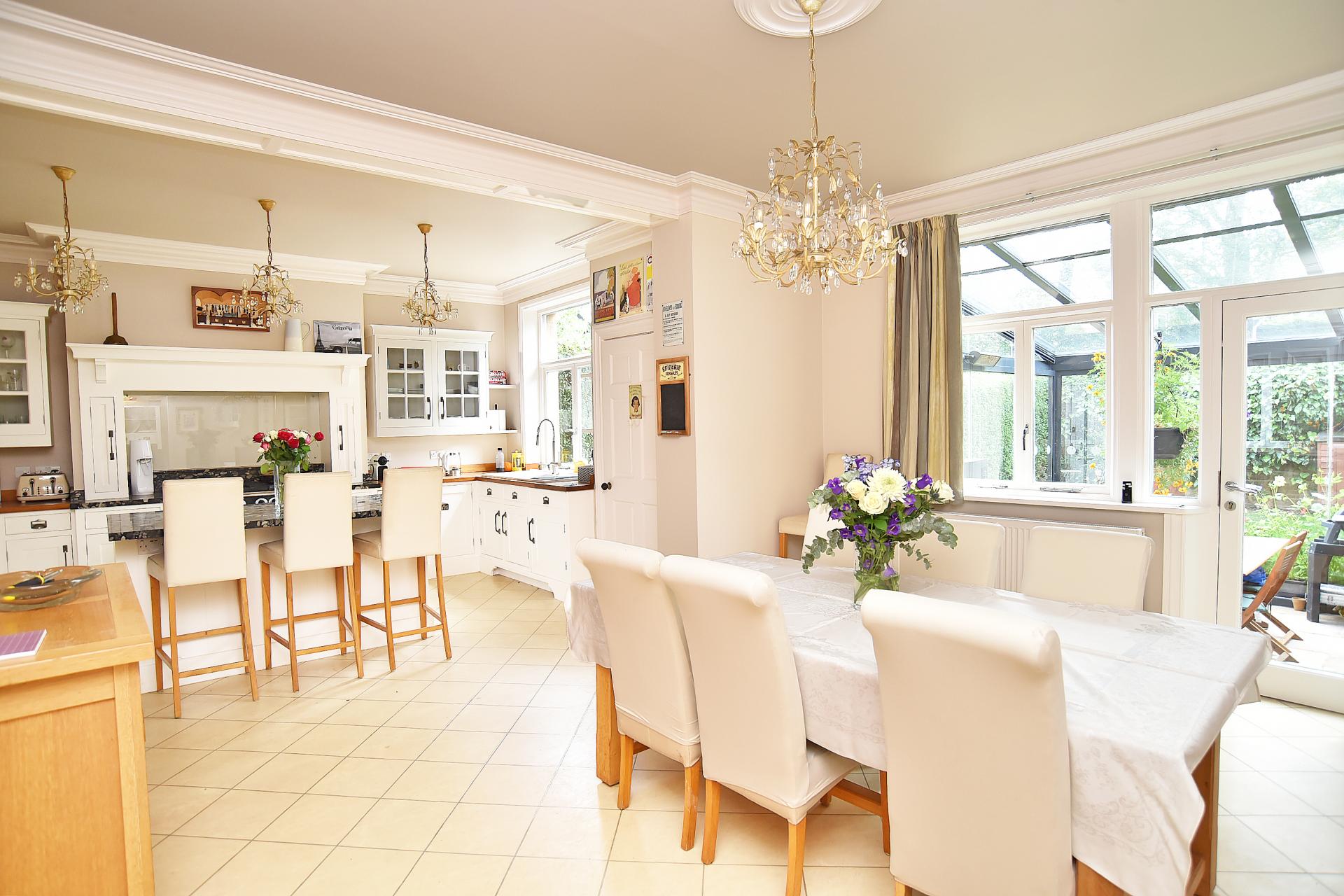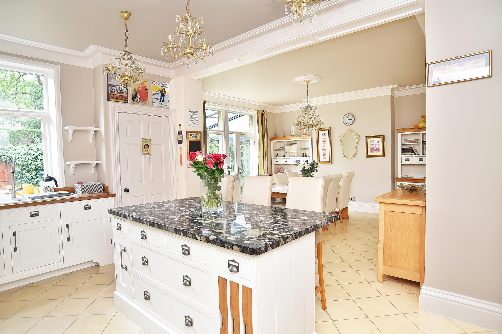 The main ground floor has a welcoming reception hall and a generous living room with a cast-iron fireplace and plenty of natural light from its large leaded windows. There is further everyday living and entertaining space on the split ground-floor level, including a substantial open-plan kitchen and dining area. The kitchen is fitted with Shaker-style units in white, as well as a central island and integrated appliances, with the dining are providing plenty of space for a good-sized family table and chairs and leads out to a sunny garden room.